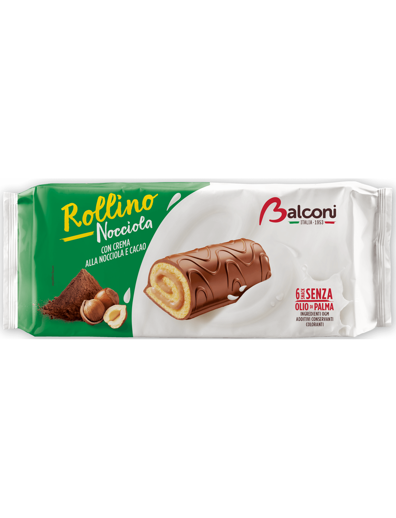 Rollino Nocciola, вершкове ласощі: згорнутий бісквіт і вишуканий горіховий крем, вкритий какао.