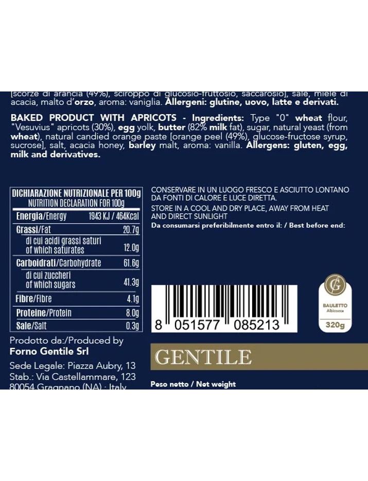 Склад: борошно пшеничне типу "0", абрикоси з Везувію 26%, яєчний жовток пастеризований 15,6%, ВЕРШКОВЕ МАСЛО пастеризоване 15,6% (82% жиру), цукор, натуральні дріжджі з пшениці, паста з натурально зацукрованих апельсинів (апельсинові шкірки 49%, глюкозно-фруктозний сироп, сахароза), емульгатор (моно- та дигліцериди жирних кислот (Е471) 0,8%), сіль харчова, мед акацієвий, ячмінний солод, ваніль.