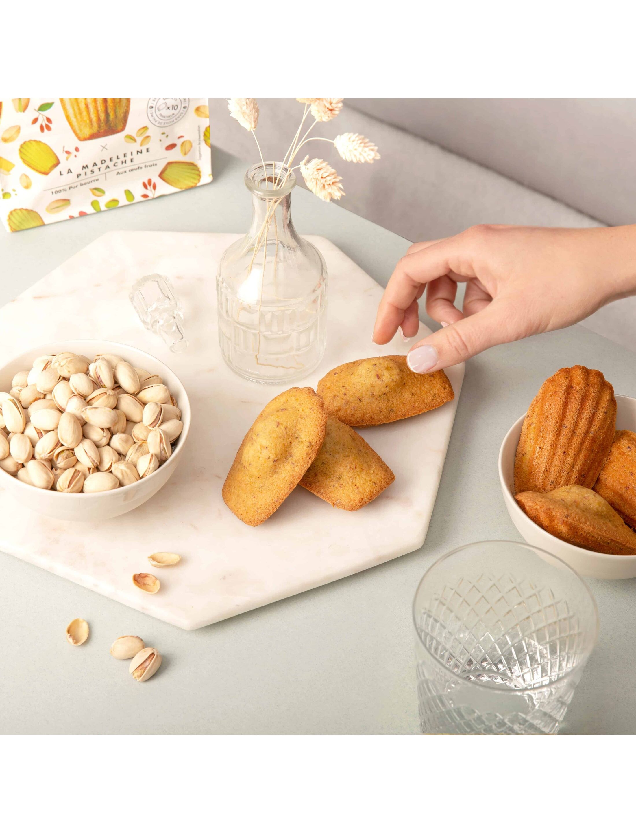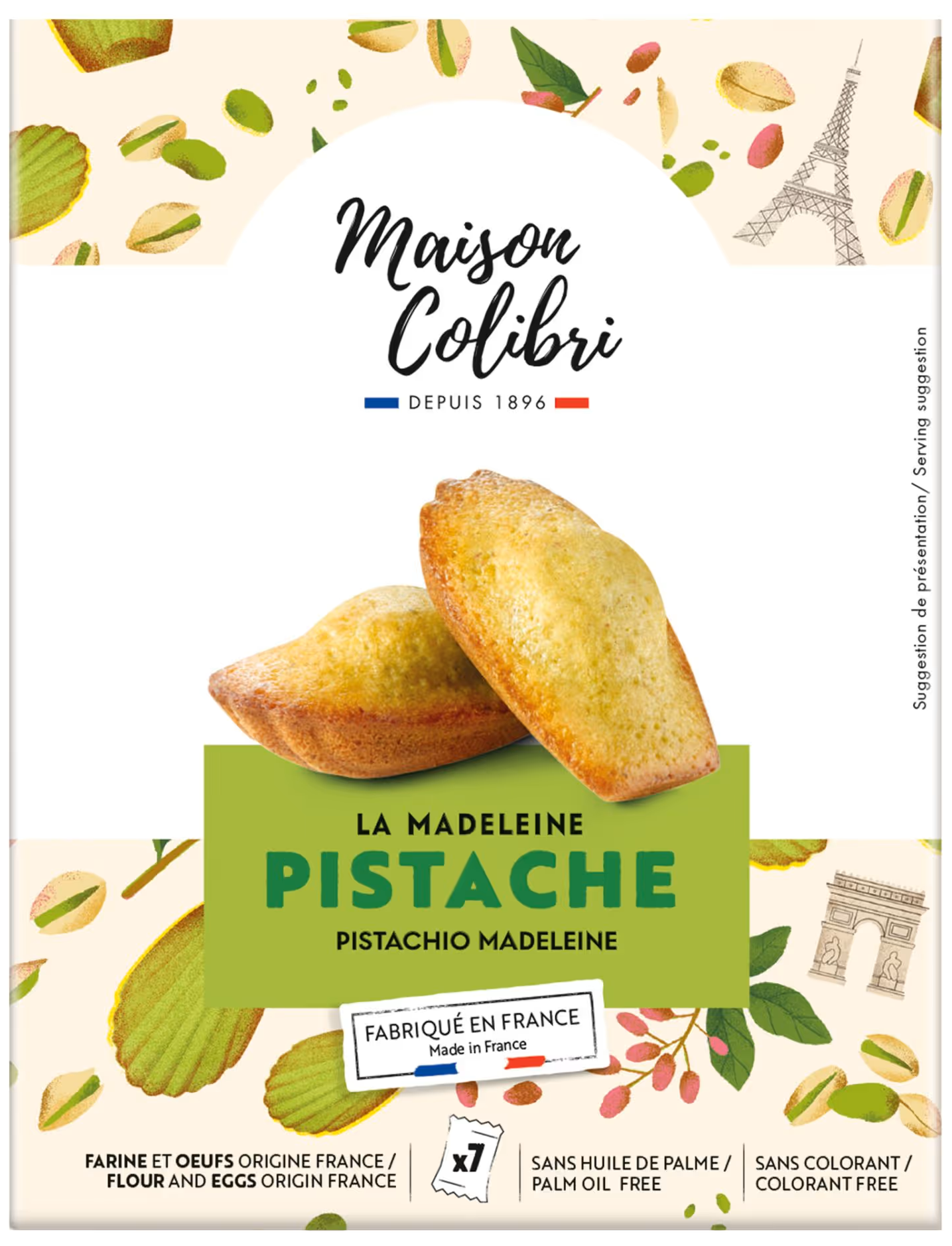 Для всіх шанувальників аперитивів, для всіх, хто поспішає купити фісташки і ніколи не залишає останню, Maison Colibri створив оригінальний та смачний мадлен, який неодмінно змусить вас захотіти його спробувати. Фісташковий мадлен з його насиченим смаком задовольнить усіх любителів цього інгредієнта. Без штучних барвників та ароматизаторів, зі свіжими яйцями та 100% чистим маслом, рецепт цього мадлену насичений смаком. На сніданок, як десерт або для приготування оригінальних аперитивів з друзями, цей винахідливий рецепт здивує всіх, хто його скуштує! Однак будьте обережні. Хоча він продається в пакетах по 30 шт., цей мадлен швидко зникне з ваших столів, на велику радість ваших гостей. Ми готуємо всі рецепти наших мадленів у нашій історичній майстерні в Понсі, Шаранта-Приморська. Ми створюємо винахідливі рецепти вже 120 років, а фісташковий мадлен є одним з наших бестселерів. Якщо ви шанувальник оригінальних рецептів, не соромтеся відвідати наш магазин, щоб відкрити для себе малиновий мадлен або нашу останню новинку: мадлен з кленовим сиропом та горіхами пеканом. Невеликі ласощі, виготовлені в нашій майстерні в Понсі, у Шарант-Марітім, на радість нашим смаковим рецепторам. Вам подобаються оригінальні рецепти? Що ви думаєте про те, щоб відкрити для себе інші мадлен, які такі ж смачні та несподівані!