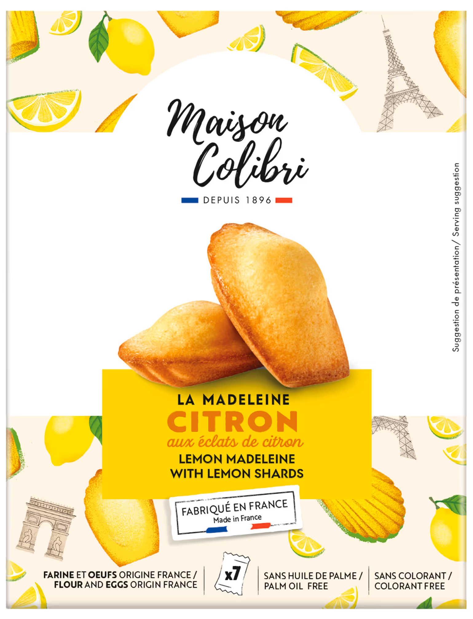 Склад: пшеничне борошно 31,5%, цукор 23,5%, ЯЙЦЯ від курей вільного вигулу 20,5%, ріпакова олія 19,5%, лимонний сік 3,5%, вершкове масло (МОЛОКО) 3%, стабілізатор: гліцерин, шматочки зневодненого лимона 2%, натуральний ароматизатор лимона, розпушувач: карбонат натрію, натуральний ароматизатор ванілі (містить спирт), сіль.