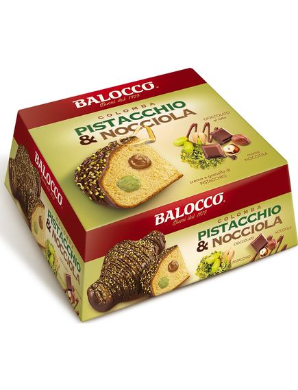 Коломба, начинена смачними кремами з фісташок і фундука, вкрита молочним і темним шоколадом і карамелізованими зернами фісташок.