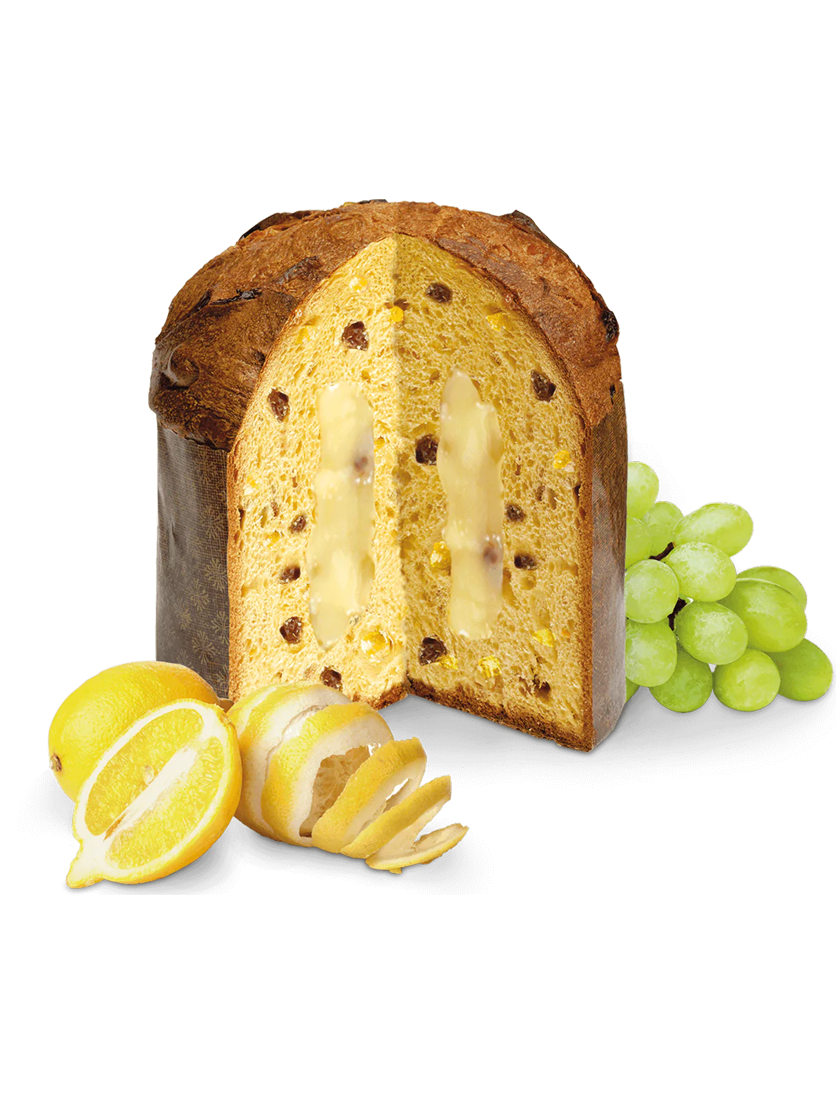 Склад: пшеничне борошно, лимонні вершки (14%) [сироп глюкози, цукор, вода, цедра лимона Сіракузи PGI (5%), підсолоджений яєчний жовток, вершкове масло, етиловий спирт, алкогольний настрій Amalfi limoncello PGI, молочний протеїн, загущувач: модифікований кукурудзяний крохмаль, суха молочна сироватка, гелеутворювач: пектин, емульгатор: моно та дигліцериди рослинного походження, жирні кислоти, натуральні ароматизатори], свіжі яйця, вирощені на землі, родзинки султан (11%), цукор, цукати лимонної цедри та мелений (9%) [цедра лимона (53%), цукор, глюкозно-фруктозний сироп, концентрований лимонний сік], вершкове масло (8%), закваска натуральна (пшениця), емульгатор: моно- та дигліцериди жирних кислот рослинного походження, свіжий яєчний жовток, вирощений на землі, інвертований цукор, сіль, натуральні ароматизатори.
