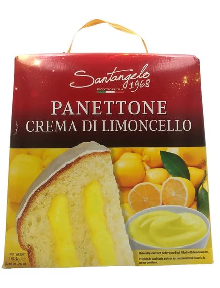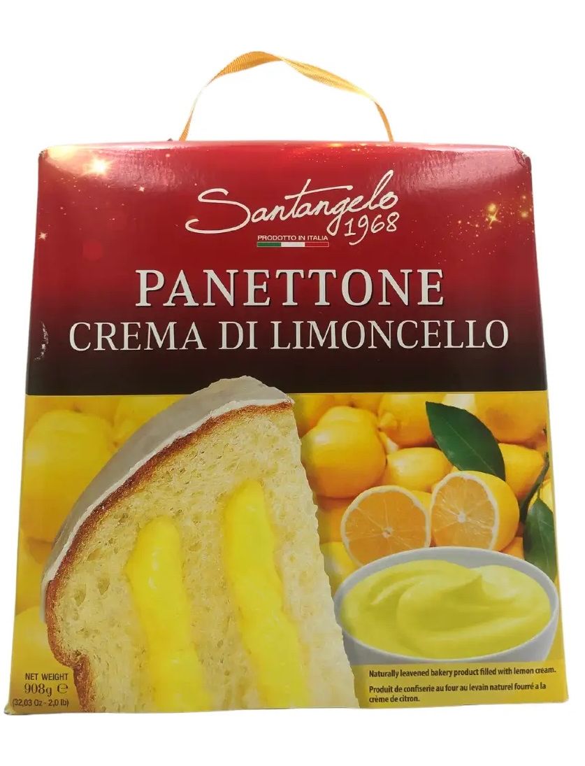 Santangelo 1968, Італія - Panettone alla Crema di Limoncello. Традиційний Панеттон від лінії святкової випічки Santangelo. Приготовлений за класичним старовинним рецептом Панеттоне - на основі повітряного борошна Манітоба та прянощів, доповнений вишуканим лимонним кремом і покритий білою глазур'ю. Santangelo "Panettone al Limoncello" має екстра-м'яку текстуру з характерною вологістю і ніжним цитрусовим смаком з нотами прянощів. Ідеально поєднується з кухлем гарячої кави, ароматного чаю або келихом ігристого вина. Santangelo Panettone стане варіантом вишуканого подарунка для сім'ї та друзів, а також прикрасою святкового столу. Запакований у велику картонну коробочку з ручкою – спеціально для презенту. Вага продукту – 908 р.