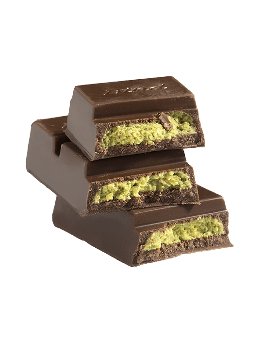 Склад: молочний шоколад (цукор, какао-масло, сухе незбиране молоко, сухе знежирене молоко, какао терте, молочний жир, емульгатор (лецитин соняшнику), ароматизатор (ваніль)), начинка (цукор, какао-масло, сухе незбиране молоко, сухе знежирене молоко, сироватка демінералізована, олія рослинна (пальмова), фісташки, кадаїф смажений (містить глютен)).
