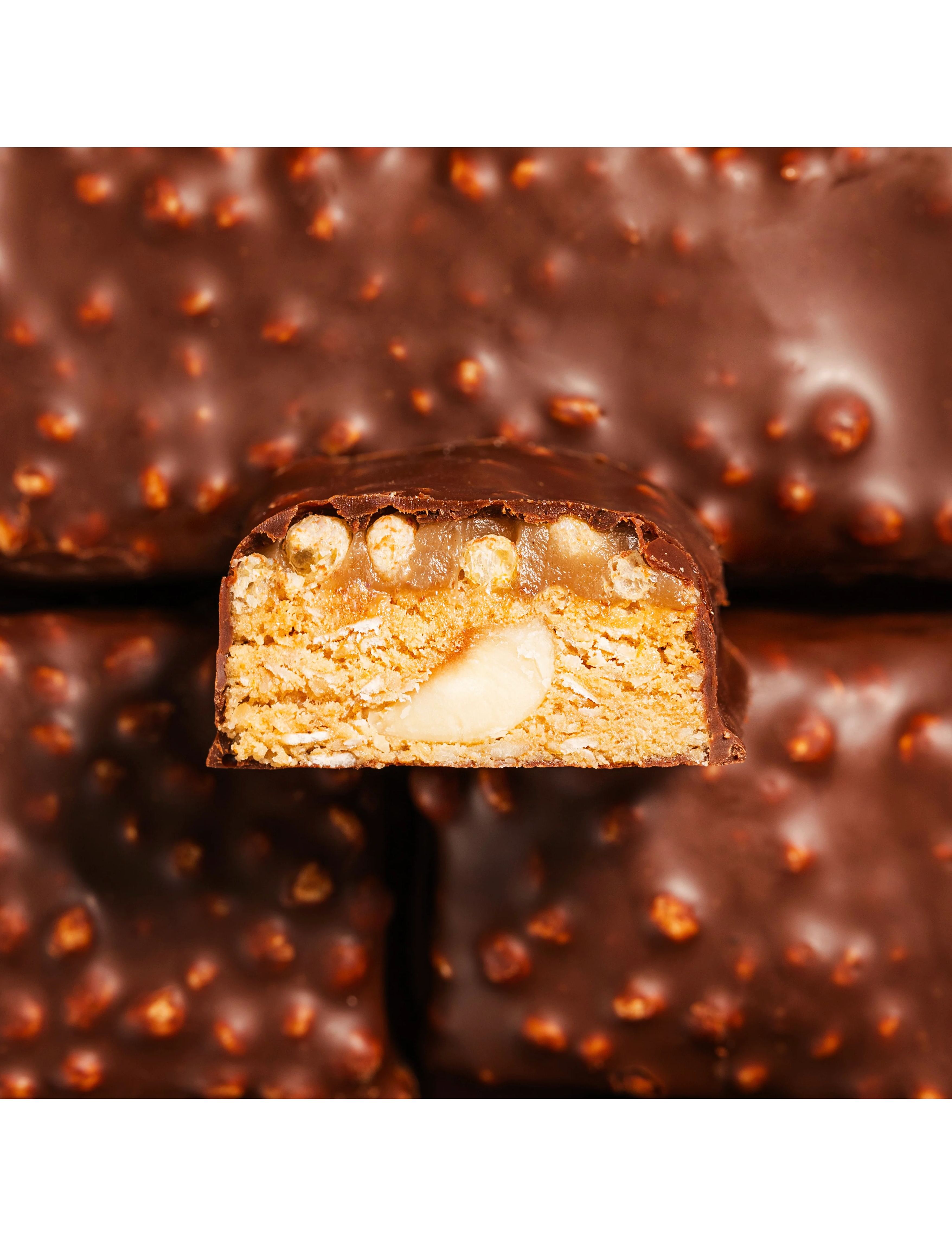 Crispy Hazelnut – це низькокалорійний веганський батончик з яскравим смаком фундука, ніжної тягучої карамелі та шоколадною глазурʼю зверху.