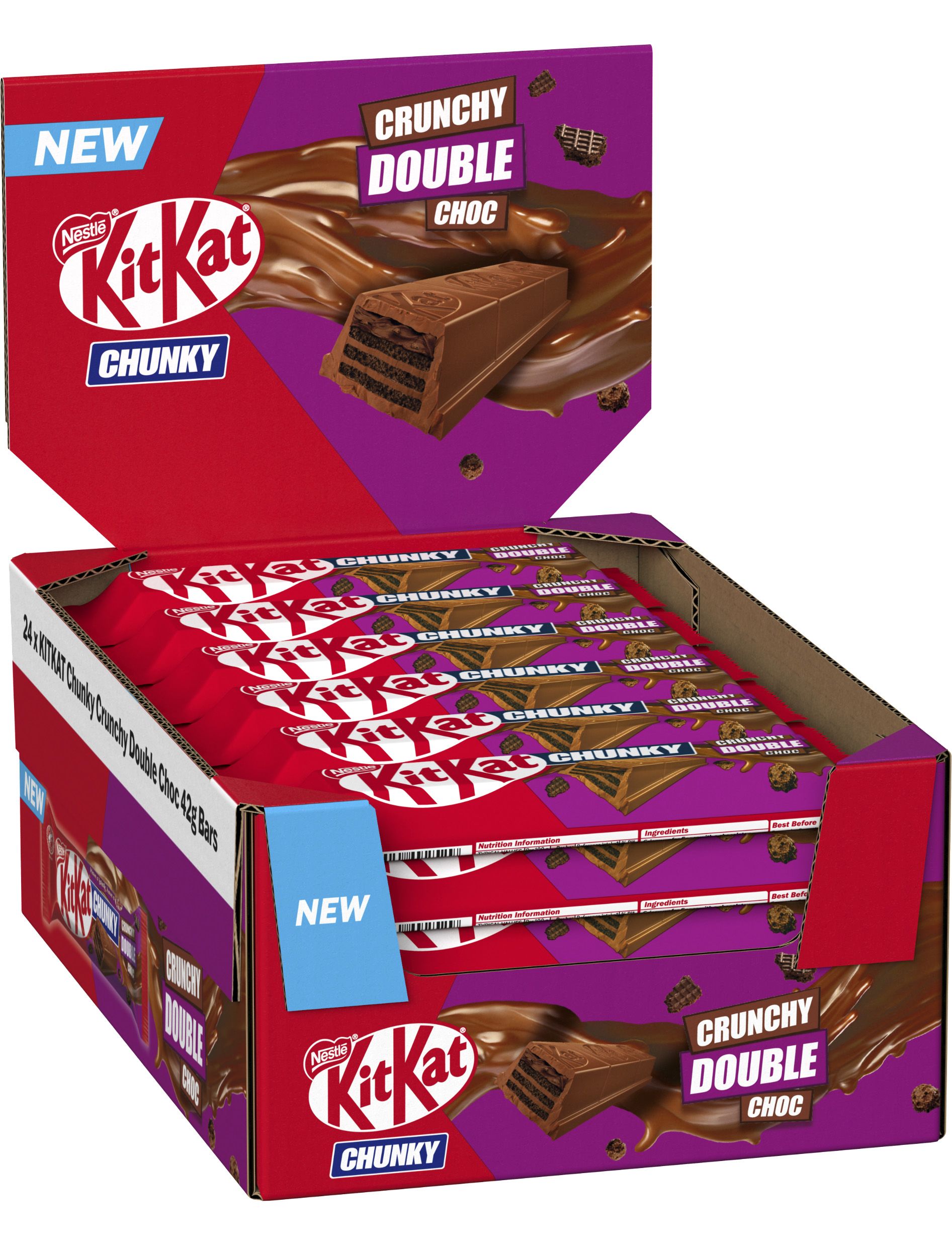 Спробуй новий супершоколадний батончик KitKat Chunky Crunchy Double Choc: шоколадний ззовні та всередині! Хрумка какао вафелька KitKat, доповнена шаром шоколадного крему з додаванням какао кріпсів та ще й покрита товстим шаром ніжного молочного шоколаду.
