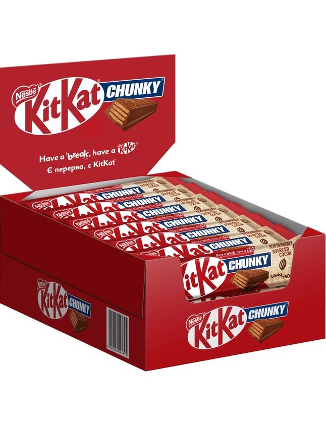 Виділіть час, щоб насолодитися смачною та приємною перервою з KitKat Chunky у молочному шоколаді. Виготовлено без штучних барвників або консервантів. KitKat - перший у світі глобальний кондитерський бренд, який використовує 100% какао, отримане із застосуванням методів стійкого та відновлюваного господарювання.