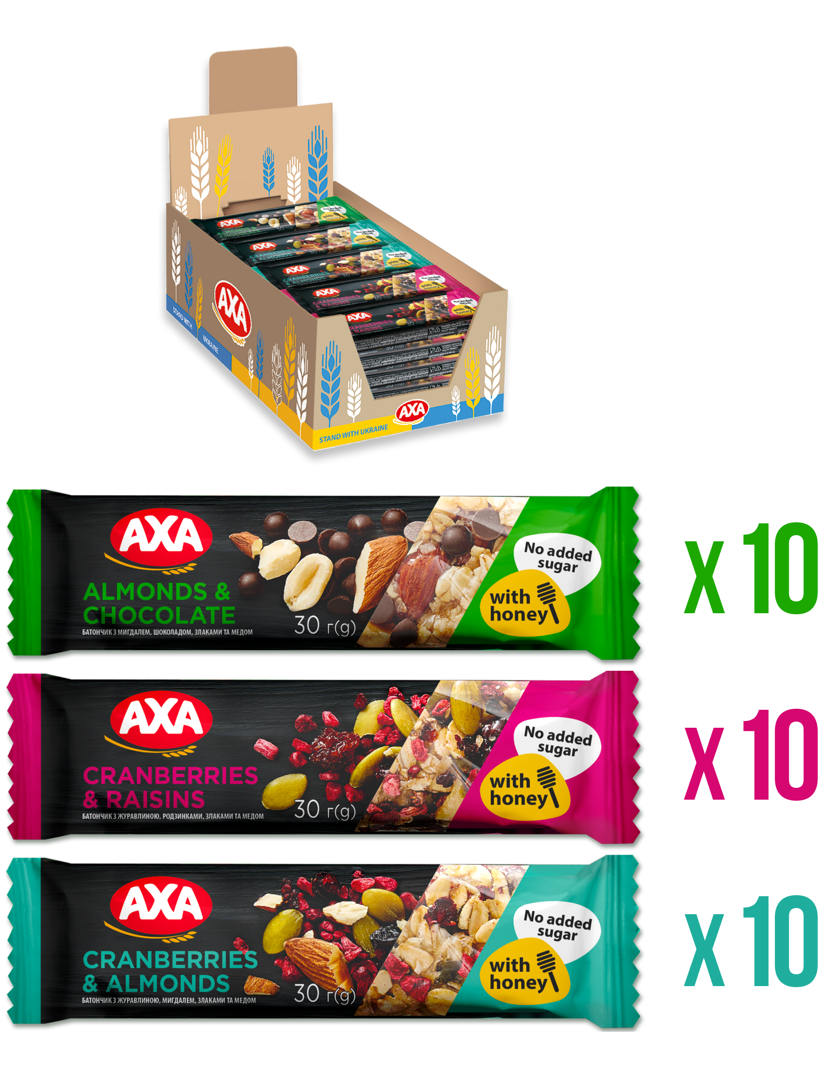 10 штук - Батончики з журавлиною, мигдалем, злаками та медом 30г10 штук - Батончики з мигдалем, шоколадом, злаками та медом 30г 10 штук - Батончики з журавлиною, родзинками, злаками та медом 30г