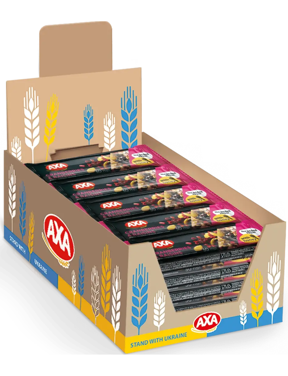 Склад: пластівці вівсяні 28,0%, патока крохмальна, шматочки сушеної журавлини 17,5%,ядро насіння гарбуза смажене 13,3%,родзинки 10,5%, мед натуральний 5,1%, сік яблучний концентрований, загущувач: мальтодекстрин, олія пальмова, суміш сублімованих ягід 0,7% (малина, ожина), вологоутримуючий агент: гліцерин, емульгатор соєвий лецитин, регулятор кислотності: лимонна кислота, сіль кухонна.