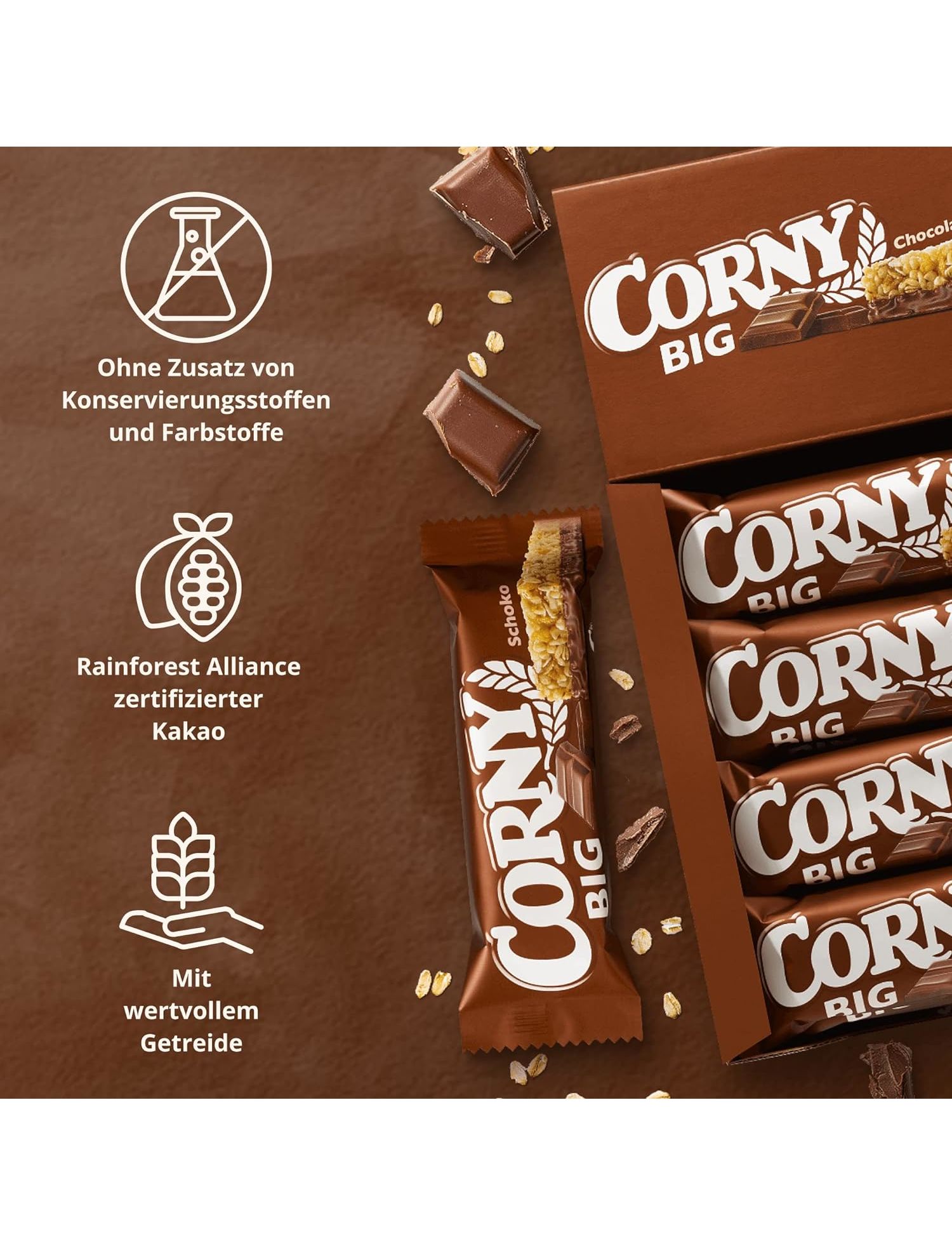 Склад: молочний шоколад 20% (цукор, какао терте*, какао-масло*, сухе знежирене молоко, вершковий жир, емульгатор лецитин), зернові чіпси (пшеничне борошно, цукор, кукурудзяне борошно, рисове борошно, екстракт ячмінного солоду, сіль, карамельний цукровий сироп), глюкозний сироп, глюкозно-фруктозний сироп, цільнозернові пластівці 10% (вівсяні, пшеничні , ячмінні), смажений арахіс, цукор, кокосовий жир, кукурудзяні пластівці (кукурудза, сіль, екстракт ячмінного солоду), мед, сіль, натуральна ароматизатори, карамельний цукровий сироп, емульгатор лецитин.