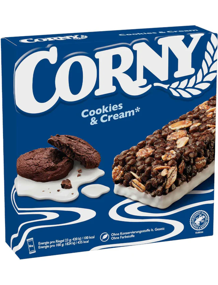 Хрумке какао-печиво та ніжні, солодкі вершки – ніхто не зможе встояти перед цим дуетом. Це неперевершене поєднання тепер також доступне у вигляді батончика CORNY: CORNY Cookies & Cream.більше