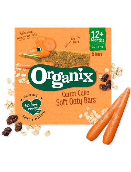 М’який, ніжний і смачний! Наші м’які вівсяні батончики Carrot Cake наповнені соковитими родзинками та цільнозерновим вівсом зі смаком справжньої моркви для малюків у дорозі