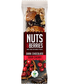 З горіхами кеш'ю, мигдалем, чорним шоколадом і вишнею, насінням соняшнику, концентратом яблучного соку, морською сіллю, листковим рисом, рисом і сиропом агави.