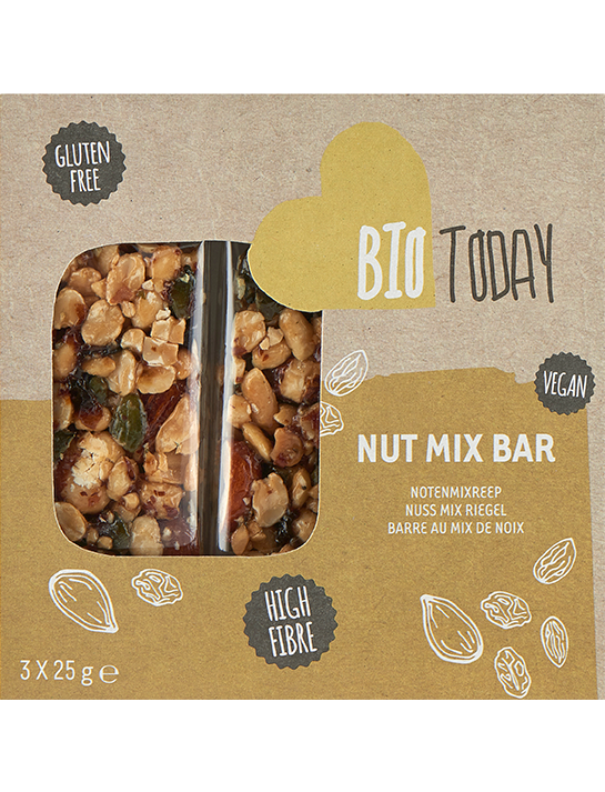 Склад: арахіс*44%, мигдаль* 13%, родзинки* (родзинки*, соняшникова олія*), гарбузове насіння*, інулін*, рисовий сироп*. *=Органічний інгредієнт.