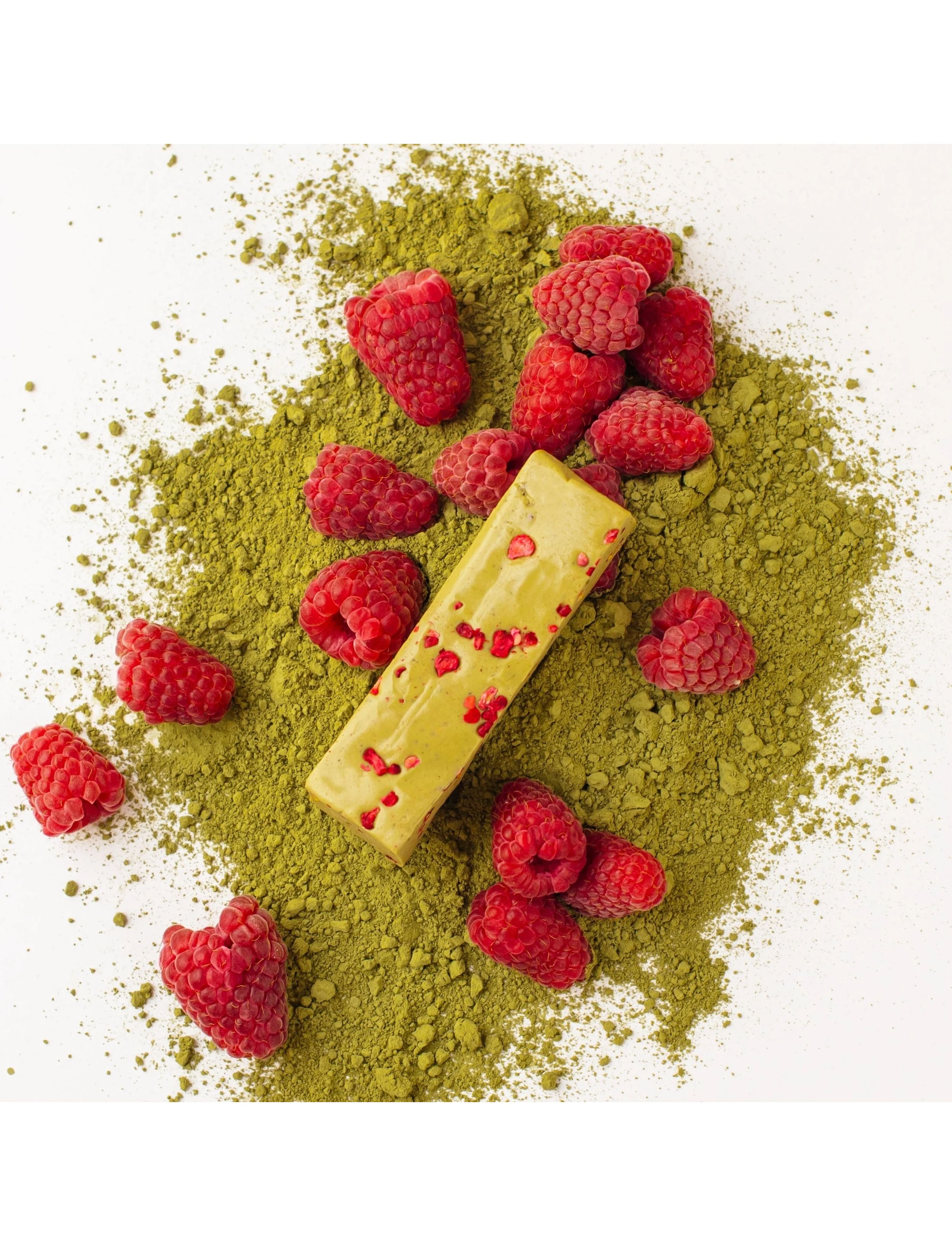 Склад: екстракт яблучного соку концентрований, ізолят протеїну горохового (26,9%) (містить 85% білка), ядра бобів арахісу (20,2%), кокосовий порошок, малина сушена (1,6%), матча порошок (1,3%), ксантанова камедь. Маса нетто: 45г.