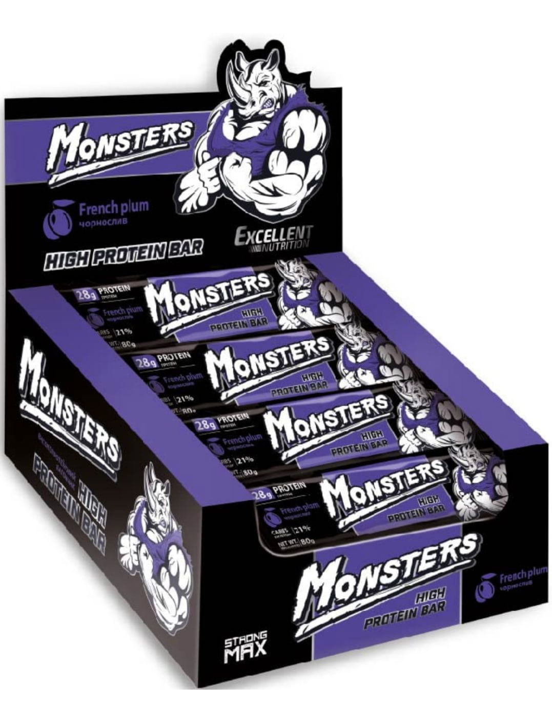 Склад: патока, концентрат сироваткового білку 22,63%, ізолят сироваткового білку 13,48%, глазур кондитерська 13% (цукор білий кристалічний, жир рослинний, какао-порошок, емульгатор соєвий лецитин, ароматизатор «Какао», сіль кухонна), фруктоза, казеїнат натрію, вологоутримуючий агент гліцерин, слива сушена (чорнослив) 2%, ароматизатор «Слива», сіль кухонна, консервант сорбінова кислота, регулятор кислотності кислота лимонна, барвник харчовий «Фіолетовий». Без ГМО.