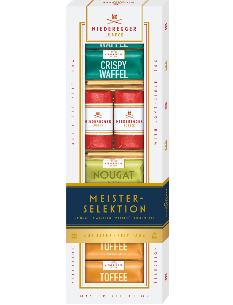 З колекцією Niederegger Master Selection ви отримуєте найпопулярніші класичні вироби у вишуканому поєднанні: ароматний марципан, нуга, що тане в роті, добірні праліне та сучасні творіння від We Love Chocolate. Збалансований асортимент молочного, темного та білого шоколаду пропонує щось на будь-який смак. Ідеально підходить як стильний подарунок, для спільного споживання або для моменту насолоди з кавою та десертом. Ретельно розроблені рецепти та відома якість Niederegger роблять цю добірку справді особливою. Побалуйте себе та відкрийте для себе, наскільки різноманітними можуть бути високоякісні кондитерські вироби – кожен шматочок є родзинкою. Ідеально підходить для будь-якої нагоди та будь-якого задоволення.