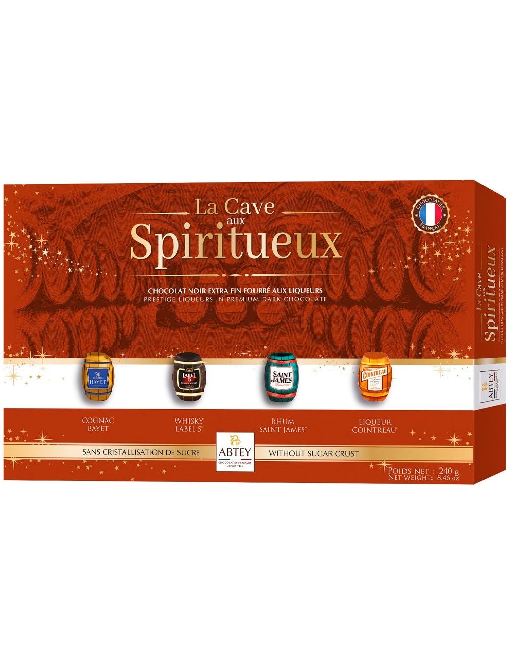 Склад: інвертний цукровий сироп, цукор, терте какао, масло какао, спирт, коньяк Bayet (1,8%), ром St James® (1,4%), Cointreau® (1,25%), віскі Label 5® (1,2%), емульгатор: соєвий лецитин, екстракт ванілі. Мінімальний вміст какао-продуктів в шоколадній масі: 51%. Країна походження шоколаду: Франція, Бельгія, Німеччина. Може містити горіхи та молоко.