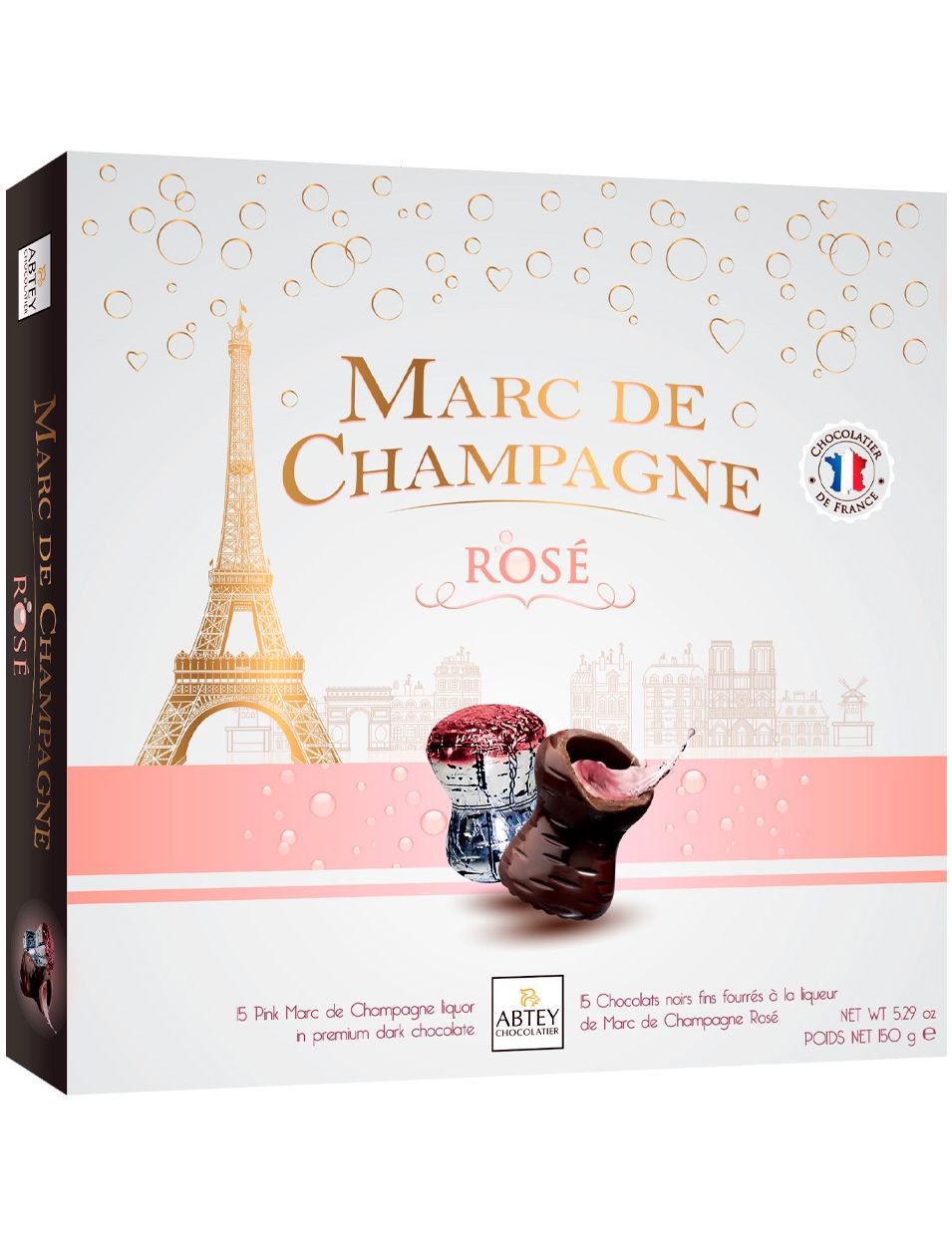 Склад: інвертний цукровий сироп, цукор, терте какао, масло какао, шампанське Marc de Champagne (6,5%), спирт, емульгатор: соєвий лецитин, екстракт ванілі. Мінімальний вміст какао-продуктів в шоколадній масі: 51%. Країна походження шоколаду: Франція, Бельгія, Німеччина. Може містити горіхи та молоко.