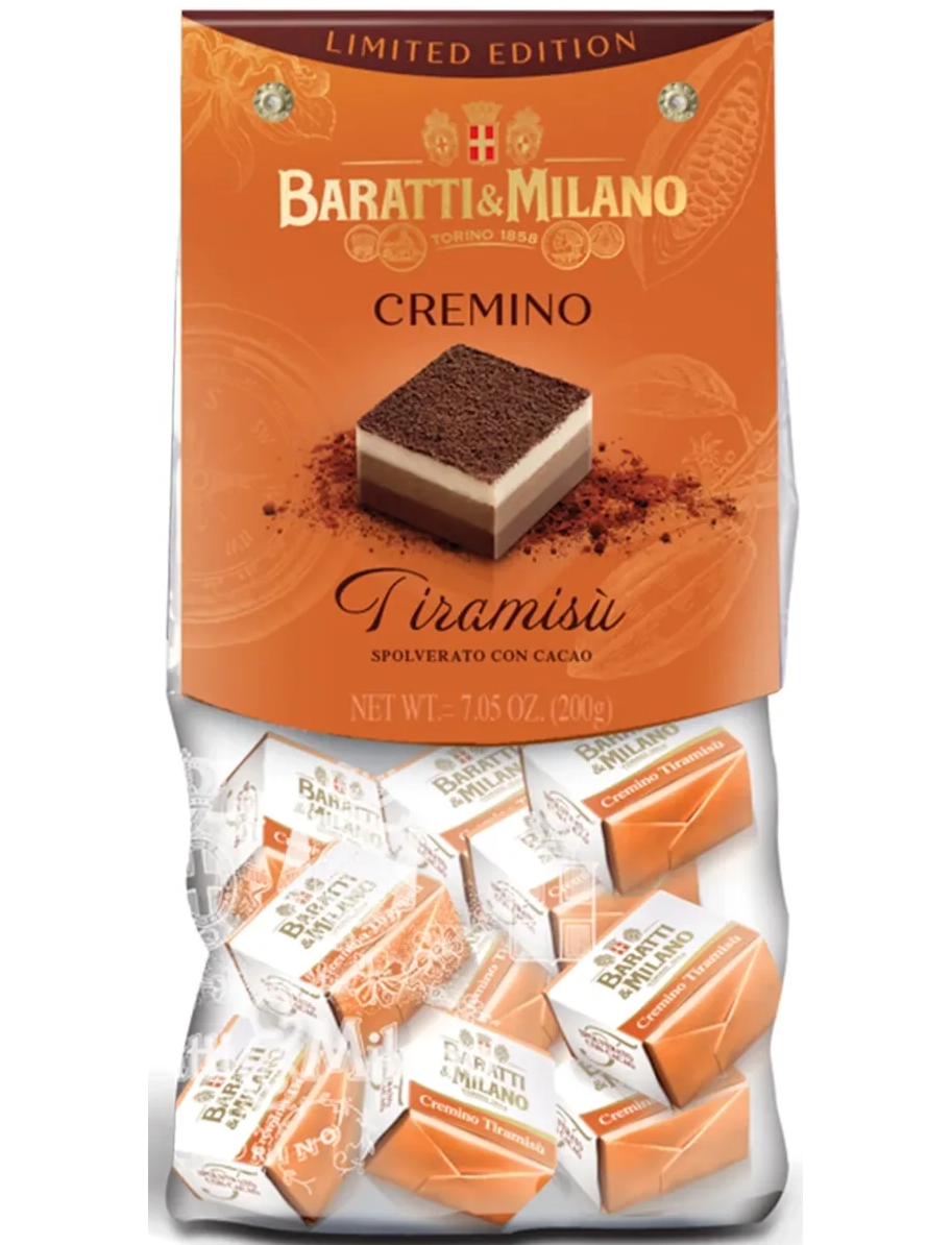 «Baratti & Milano» Cremino, натхненний одним із найулюбленіших і найвідоміших десертів італійської традиції, тут створений шляхом поєднання чудового шару джандуйї з ніжним кавовим кремом із остаточним присипкою какао. Всередині цієї елегантної сумки 200 грам креміні.