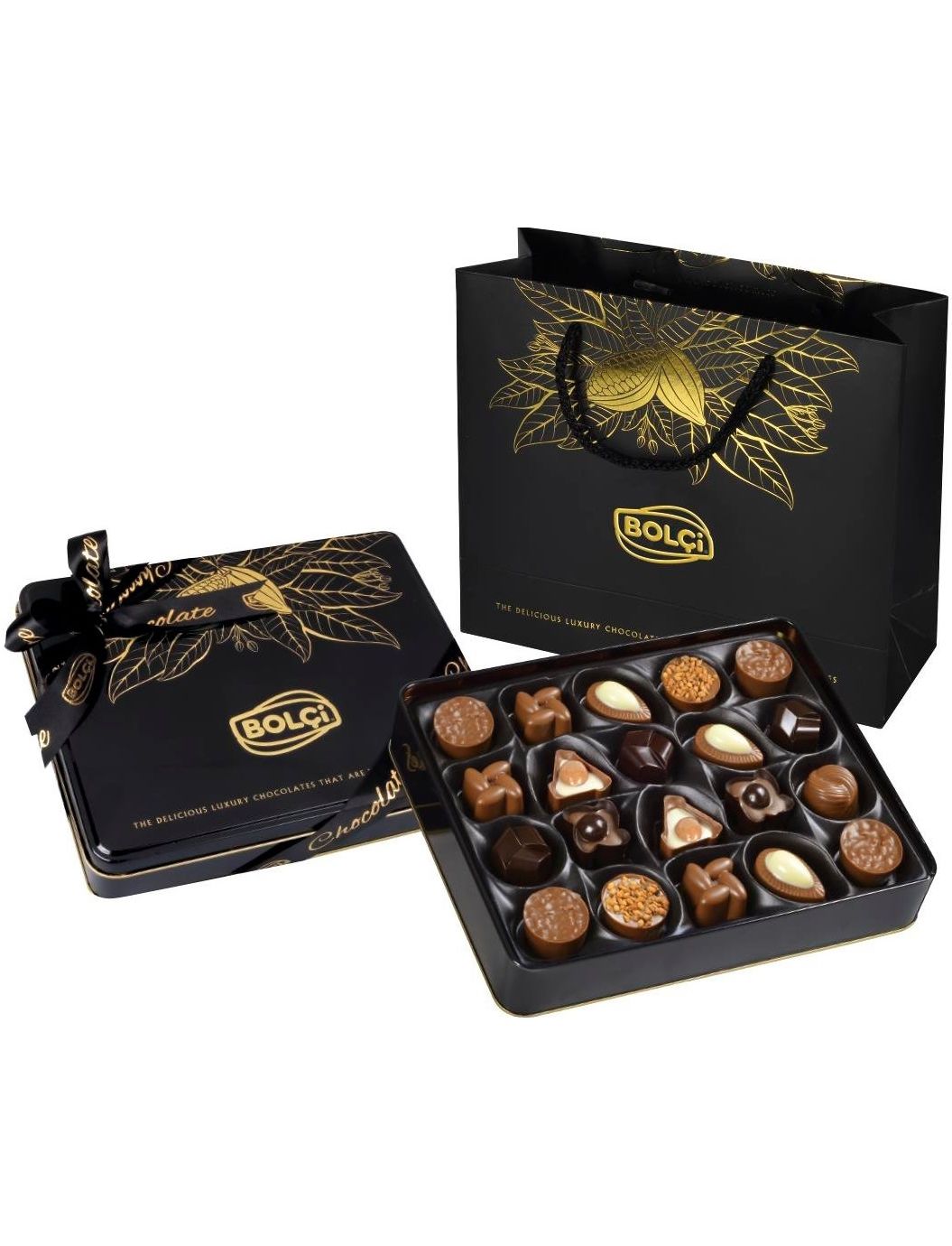 Шоколад молочний: цукор, масло какао, молоко сухе, какао терте, емульгатор (лецитин соняшниковий (Е322)), ароматизатор натуральний (ваніль). Мінімальний вміст сухого какао: 30%. Чорний шоколад: цукор, масло какао, какао терте, емульгатор (лецитин соняшнику (Е322)), ароматизатор натуральний (ваніль). Мінімальний вміст сухого какао: 55%. Шоколад білий: цукор, масло какао, молоко сухе, емульгатор (лецитин соняшниковий (Е322)), ароматизатор натуральний (ваніль). Начинка: цукор, олія рослинна, масло вершкове, молоко, сироп глюкози, молоко сухе знежирене, молоко сухе незбиране, масло какао, какао-порошок, вишня, апельсин, емульгатор (лецитин соняшниковий (Е322)), мигдаль, фундук, рис листковий, пластівці пшеничні. (цільнозернове борошно, рисове борошно, цукор, суха молочна сироватка, сіль, ванілін), ароматизатор (вишня, апельсин), регулятор кислотності (лимонна кислота), сіль, барвник (E172-E555), глазурувальник (гуміарабік) Інформація про алергени: Містить сухе молоко, фундук, мигдаль і глютен. Може містити сліди фісташок, арахісу, волоських горіхів і кунжуту.