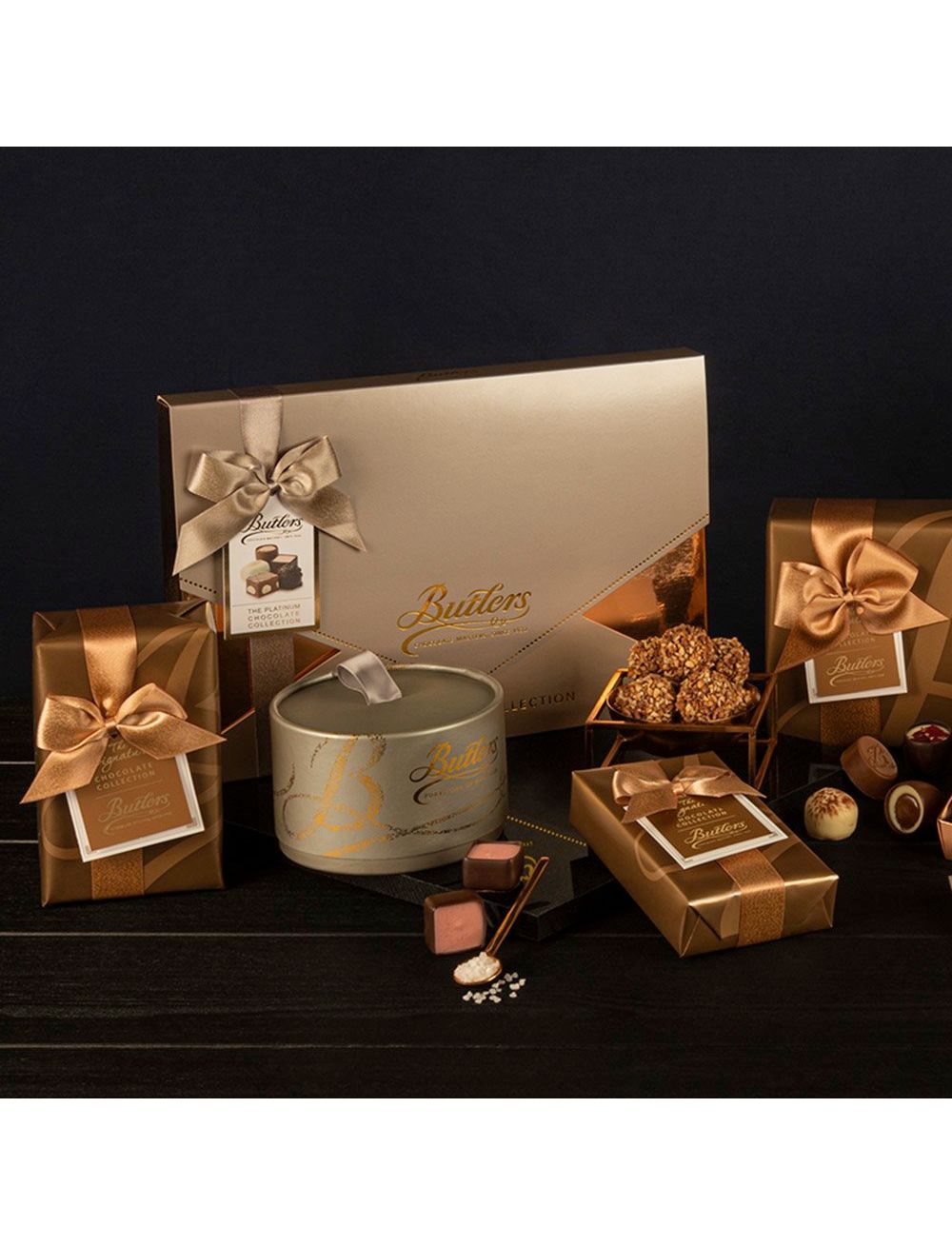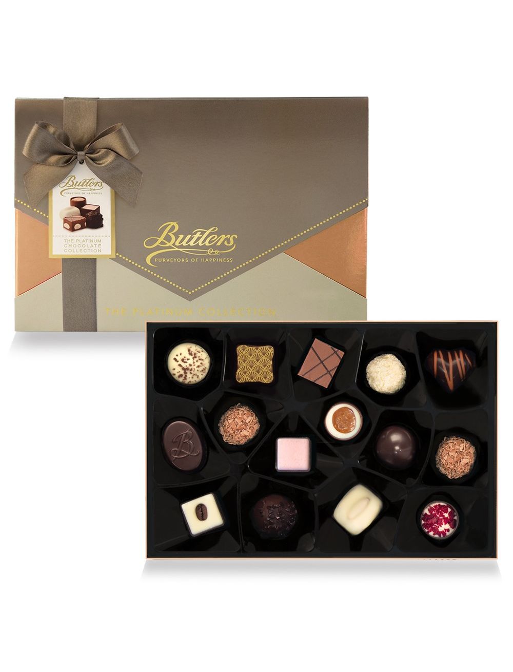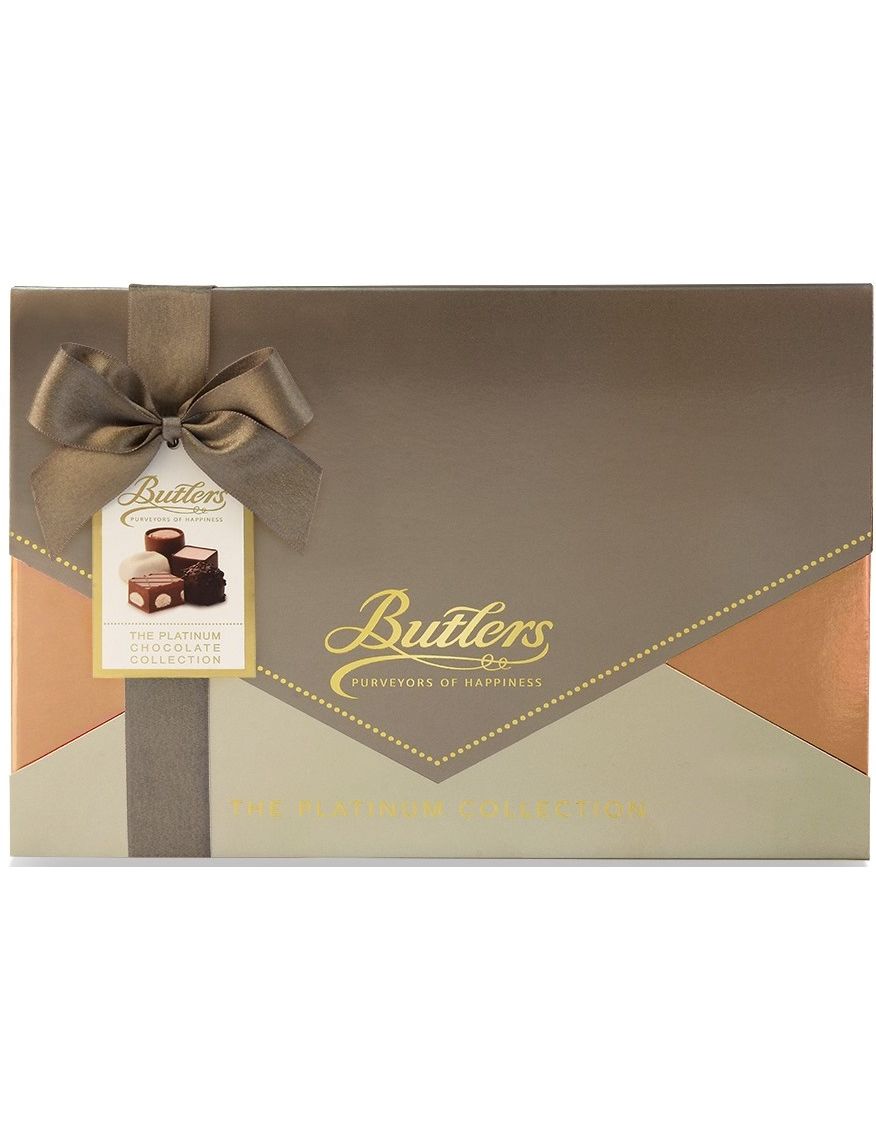 Butlers 210g Platinum Selection: одна з наших найкрасивіших презентаційних коробок. Жорстка металева коробка з рожевого золота, охоплена сучасним тонованим металевим рукавом і прикрашена багатою золотою фольгою. Це подарунок, який свідчить про вашу турботу! Кожен шоколад у цій коробці був ретельно відібраний, щоб запропонувати неперевершені враження від Батлерів.