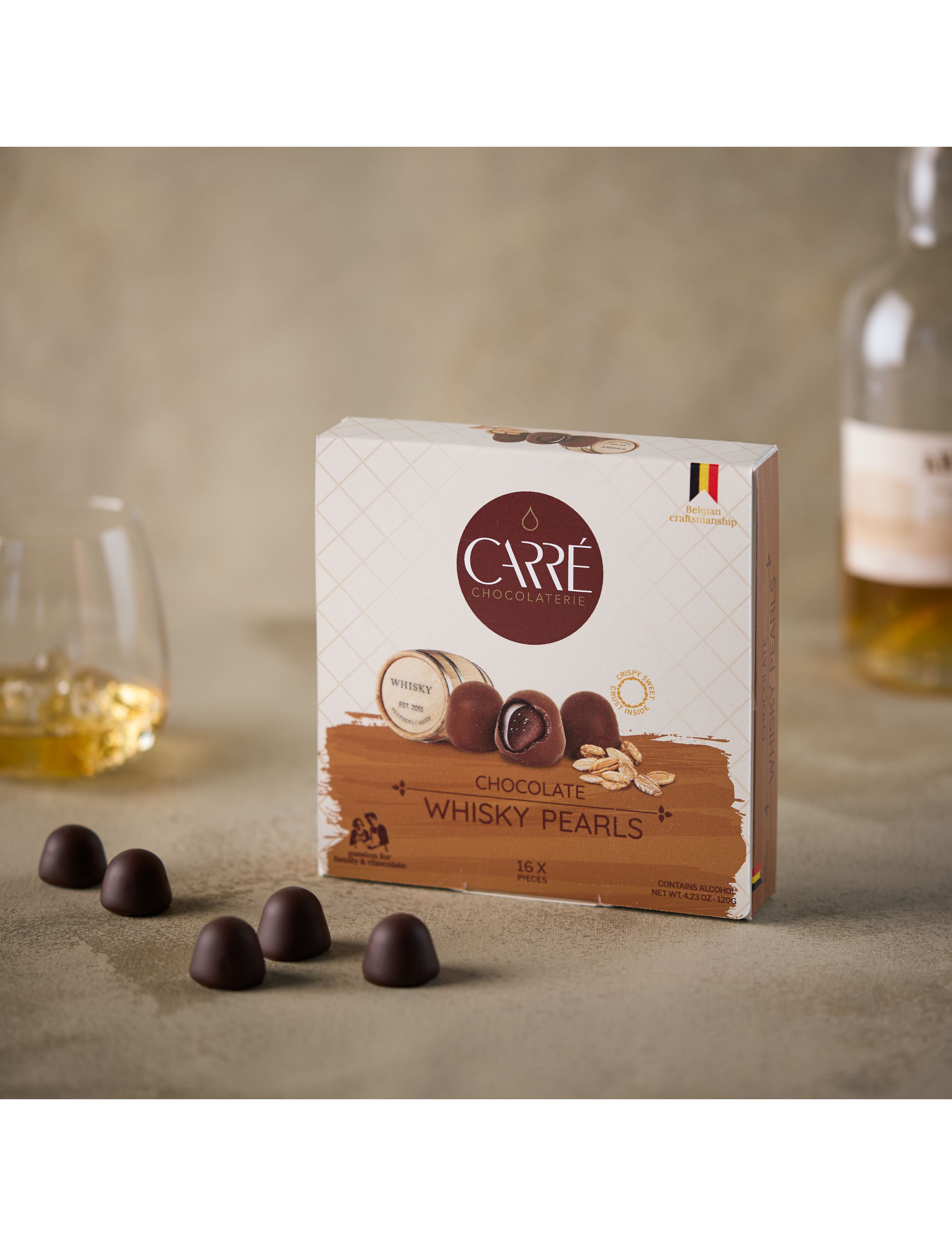 Цукерки Chocolaterie Carre з темного шоколаду з віскі – це вишукані шоколадні цукерки, які поєднують насичений бельгійський шоколад із міцним, витриманим шотландським віскі. Кожна цукерка – це маленька перлина, що приховує в собі справжню глибину смаку: оксамитова текстура шоколаду розчиняється, відкриваючи ароматний віскі з тонкими деревними нотами та теплим післясмаком.