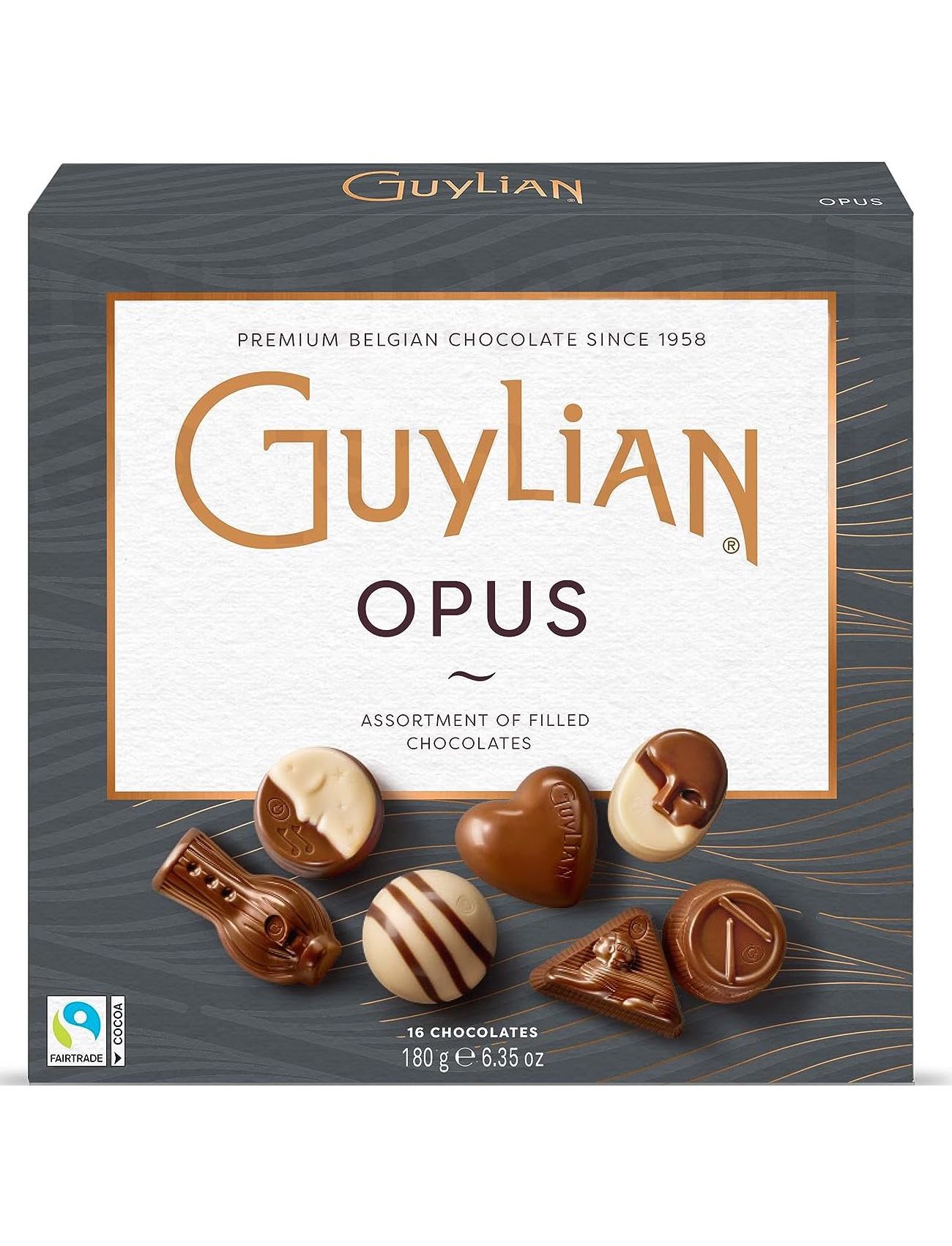 Ганаш з груші та манго, м’яка карамель, крем капучіно, оригінальне праліне, хрустке печиво та ванільний крем, м’який трюфель, смажений фундук із трюфелями, оригінальне праліне, смажений фундук.