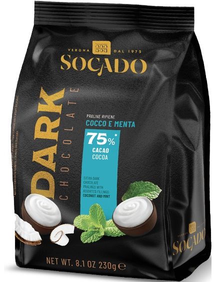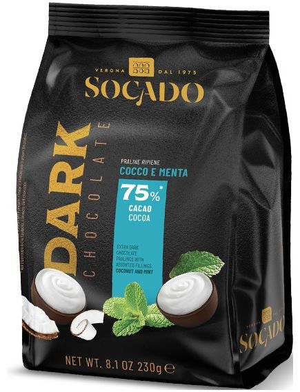 В елегантному та вишуканому зовнішньому вигляді міститься вибух темного смаку. Сильний смак екстра темного шоколаду з 75% какао чудово поєднується зі свіжими кокосовими та м'ятними начинками.