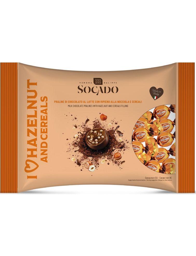 Праліне з молочного шоколаду з горіховим кремом, що обволікає, збагаченим хрусткими пластівцями.