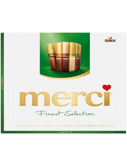 З'явившись у Німеччині в 1965 році, бренд Merci відразу знайшов шлях до сердець людей, ставши першим шоколадом, за допомогою якого можна висловити особливу подяку. Merci — це вишукане поєднання різних сортів шоколаду в індивідуальній упаковці із золотої фольги. Сьогодні Merci — це подарунок, який дарують на всіх континентах в більш ніж 100 країнах світу.