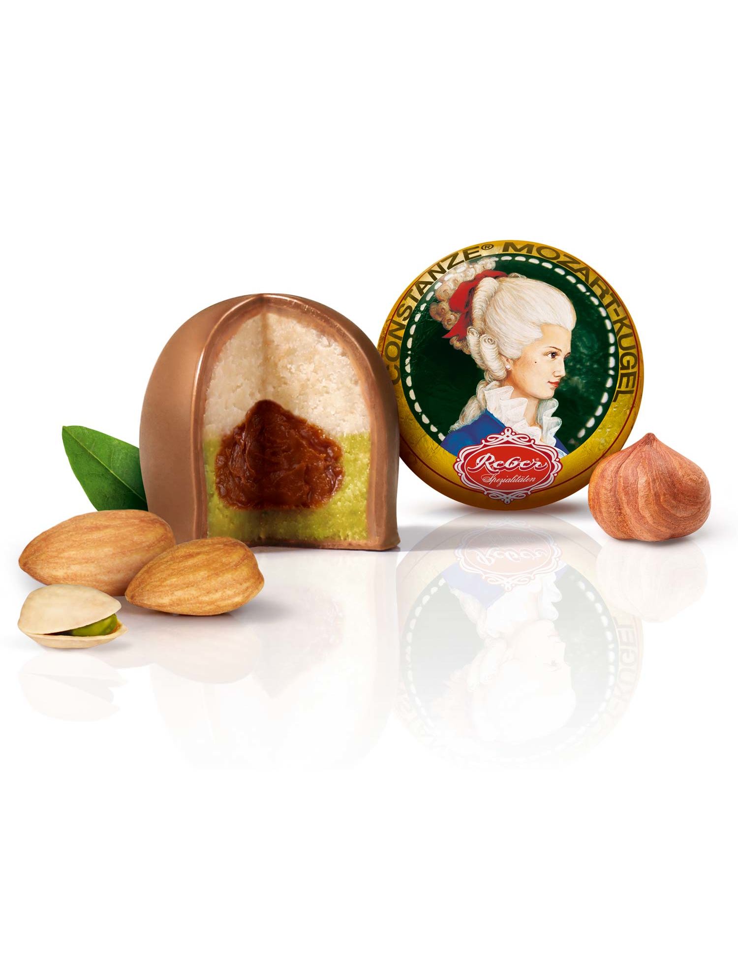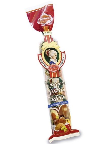 Класика. Начинені фісташковим марципаном зі свіжих зелених фісташок, мигдалю та фундукової нуги, вкриті тонким незбираним молочним шоколадом: це справжні кульки Reber Constanze Mozart.