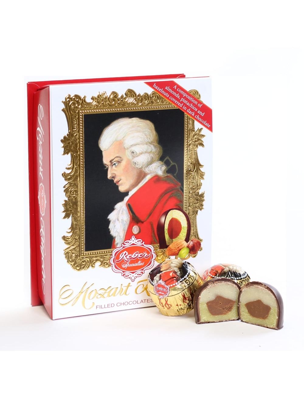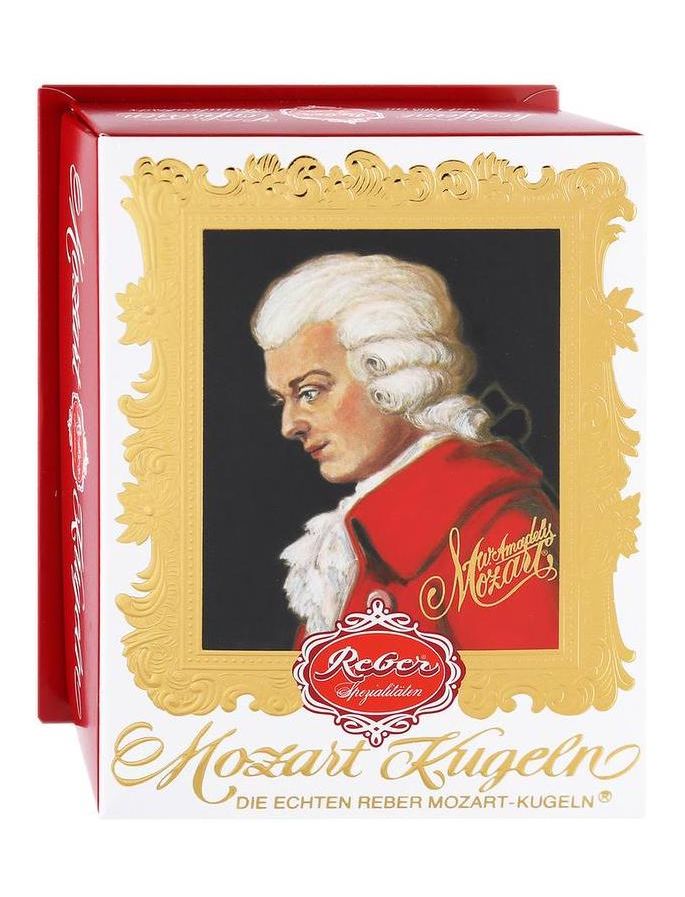 Класика. Наповнений фісташковим марципаном зі свіжих зелених фісташок, мигдалю та фундукової нуги, покритий вишуканим шоколадним праліне: це справжні кульки Reber Mozart. Так звана барокова упаковка має високоякісний дизайн із гарячим тисненням золотою фольгою і є ідеальним подарунком для особливих випадків.