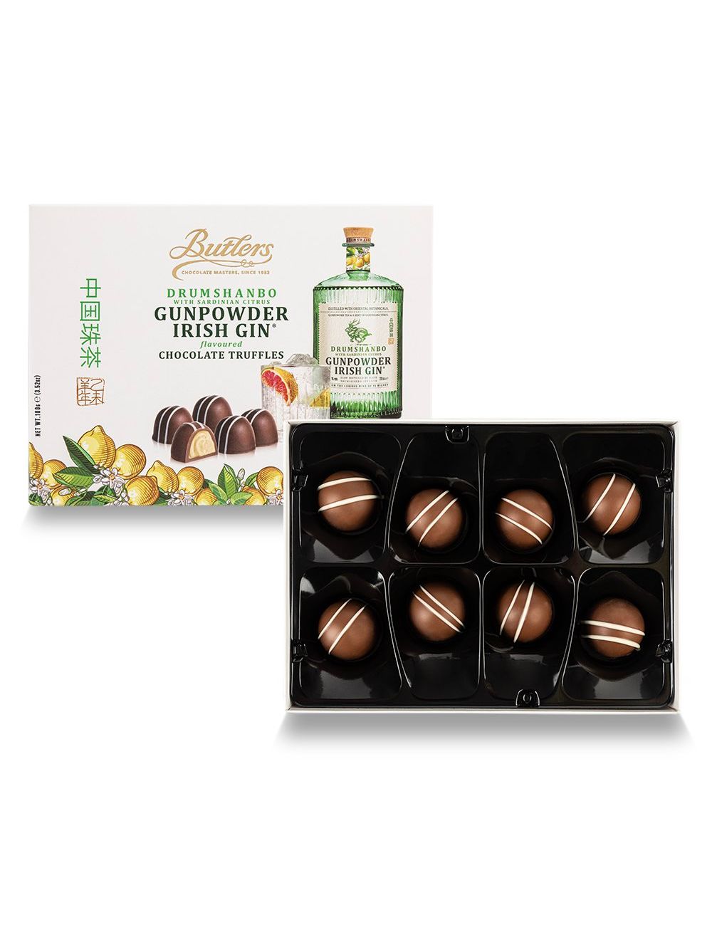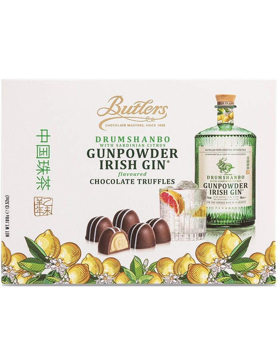 Декадентські молочно-шоколадні трюфелі Butlers з екзотичним відтінком ірландського джину Drumshanbo Gunpowder із Sardinian Citrus®, незабутнє смакове відчуття.