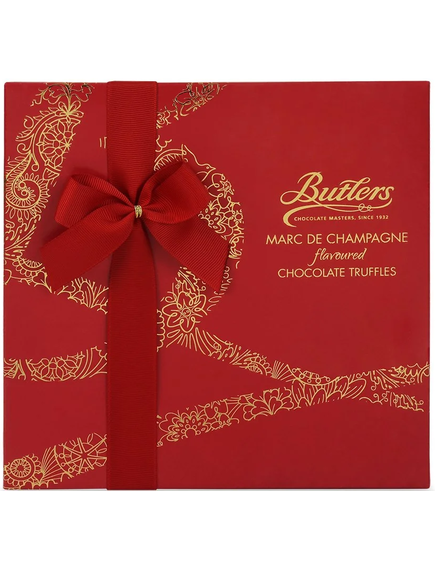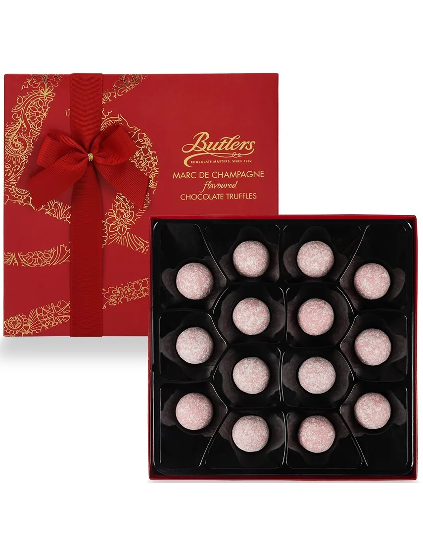 Наші ніжно-рожеві трюфелі Marc de Champagne, красиво представлені у святковій червоно-золотій подарунковій коробці, перев’язаній розкішною стрічкою.