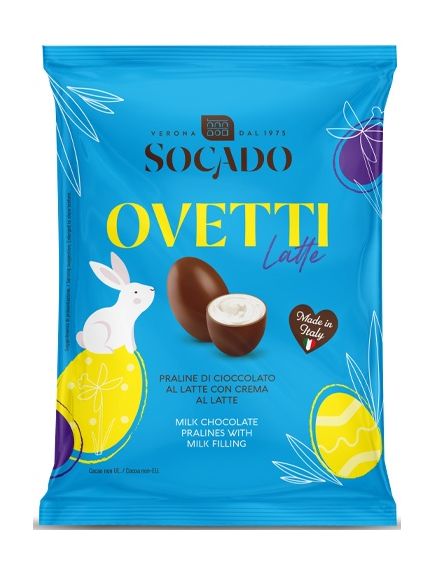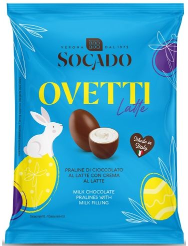 Socado Цукерки шоколадні праліне "Яйця Молочний Крем" – це ніжні італійські шоколадні цукерки у формі маленьких яєць. Вони виготовлені з молочного шоколаду, який приховує всередині кремову молочну начинку з праліне. Завдяки вишуканому смаку та елегантній упаковці, ці цукерки чудово підходять для святкових моментів, особливо на Великдень.