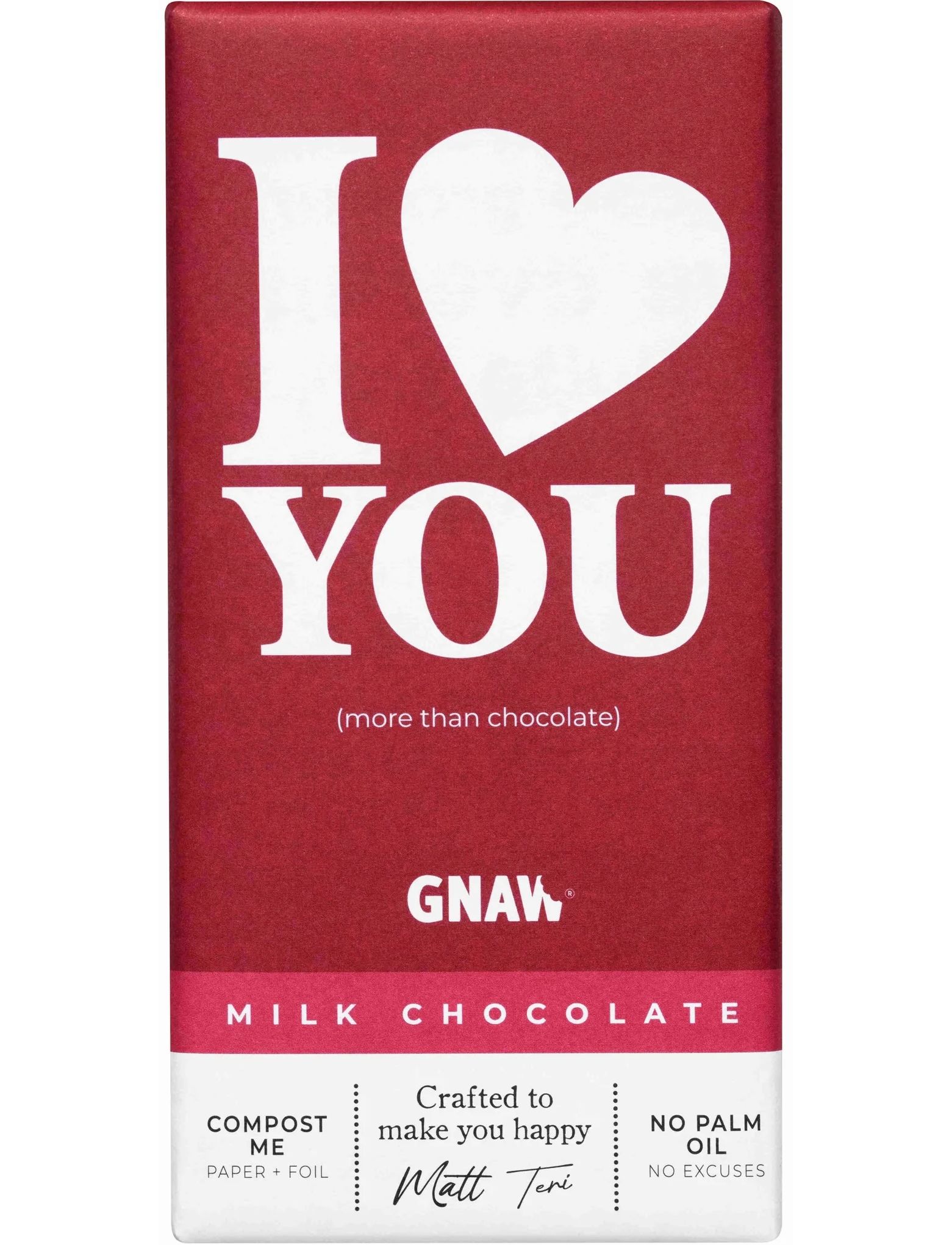 Що ви отримуєте: - 1 плитка молочного шоколаду GNAW «Love You» вагою 80 г. Кожна плитка шоколаду GNAW поставляється загорнутою в папір і фольгу, які можна компостувати в домашніх умовах.