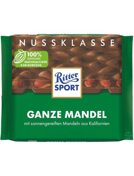 Клас горіхів Ritter Sport Цілий мигдаль вражає. Смачний цільномолочний шоколад містить цілий смажений мигдаль з Каліфорнії, природна солодкість якого ідеально гармонує з насиченим смаком шоколаду. Скуштуйте ситний делікатес, від якого сльозиться.