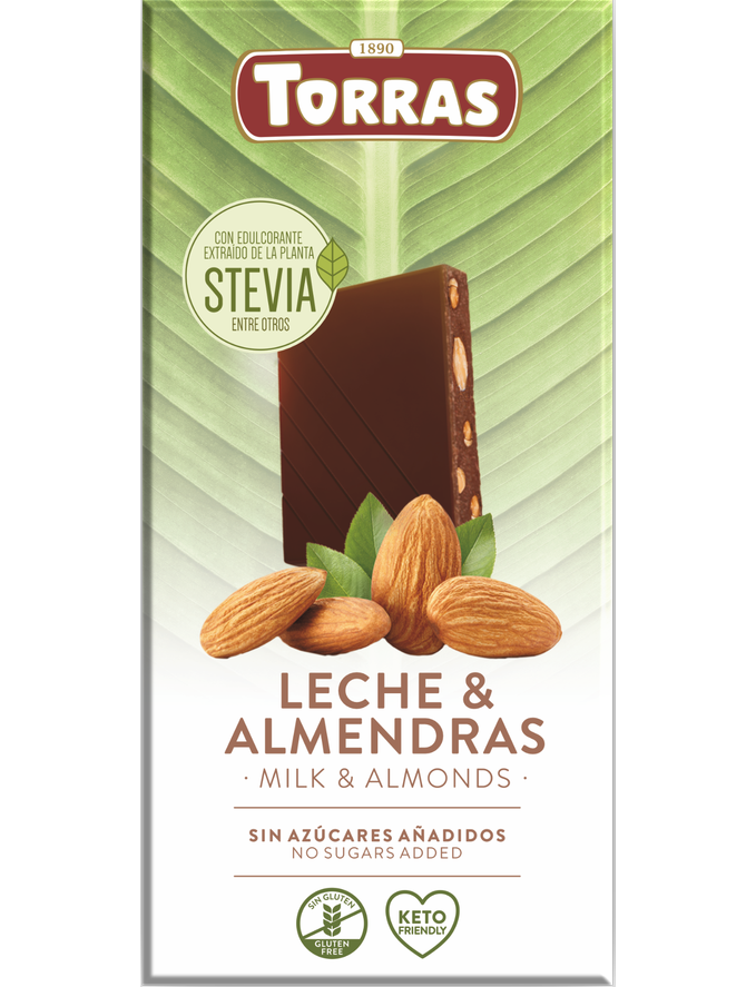 Молочний шоколад і мигдаль, підсолоджені еритритом і стевією.