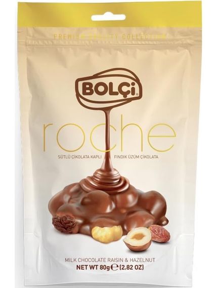 Молочний шоколад (75%) (цукор, какао-масло, сухе незбиране молоко (19%), какао терте, молоко сухе знежирене (5%), емульгатор (соняшниковий лецитин (Е322) (0,05%)), натуральний ароматизатор (ваніль), фундук (12,5%), родзинки (12,5%)). Інформація для алергіків: містить молоко та фундук; може містити сліди інших горіхів, яєць, кунжуту, сої та глютену.