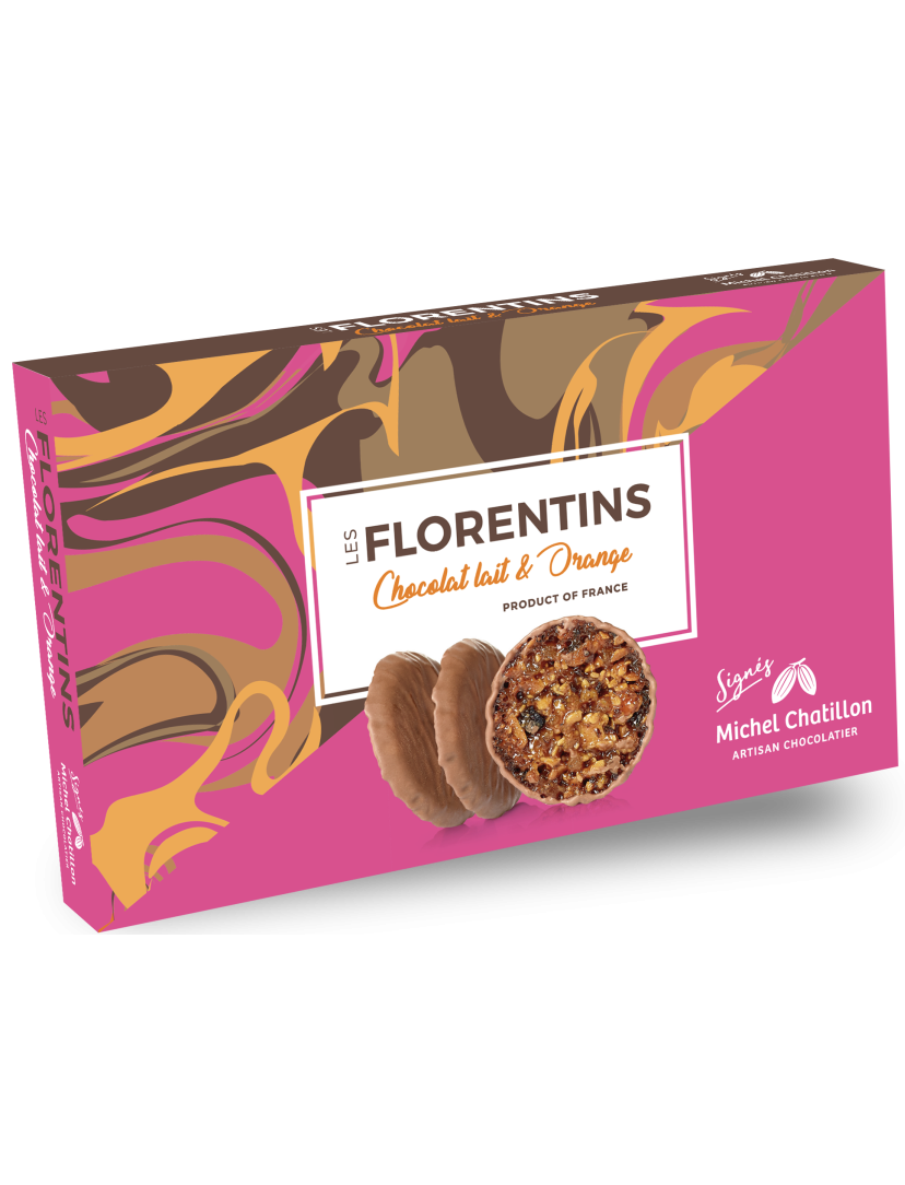 Склад: 24% бельгійського темного шоколаду, цукор, 16% цукатів апельсинової цедри, 13% мигдалю лущеного, 8% смородини, свіжого масла, свіжих вершків, 5% меду. Коробка 12 флорентійців, 100 г нетто. Французьке ручне виробництво.