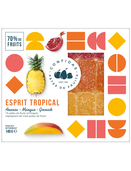 Склад: м'якоть фруктів (яблуко, ананас, манго, гранат), цукор, глюкоза, зв'язуючий елемент: пектин, підкислювач: лимонна кислота, натуральні ароматизатори.
