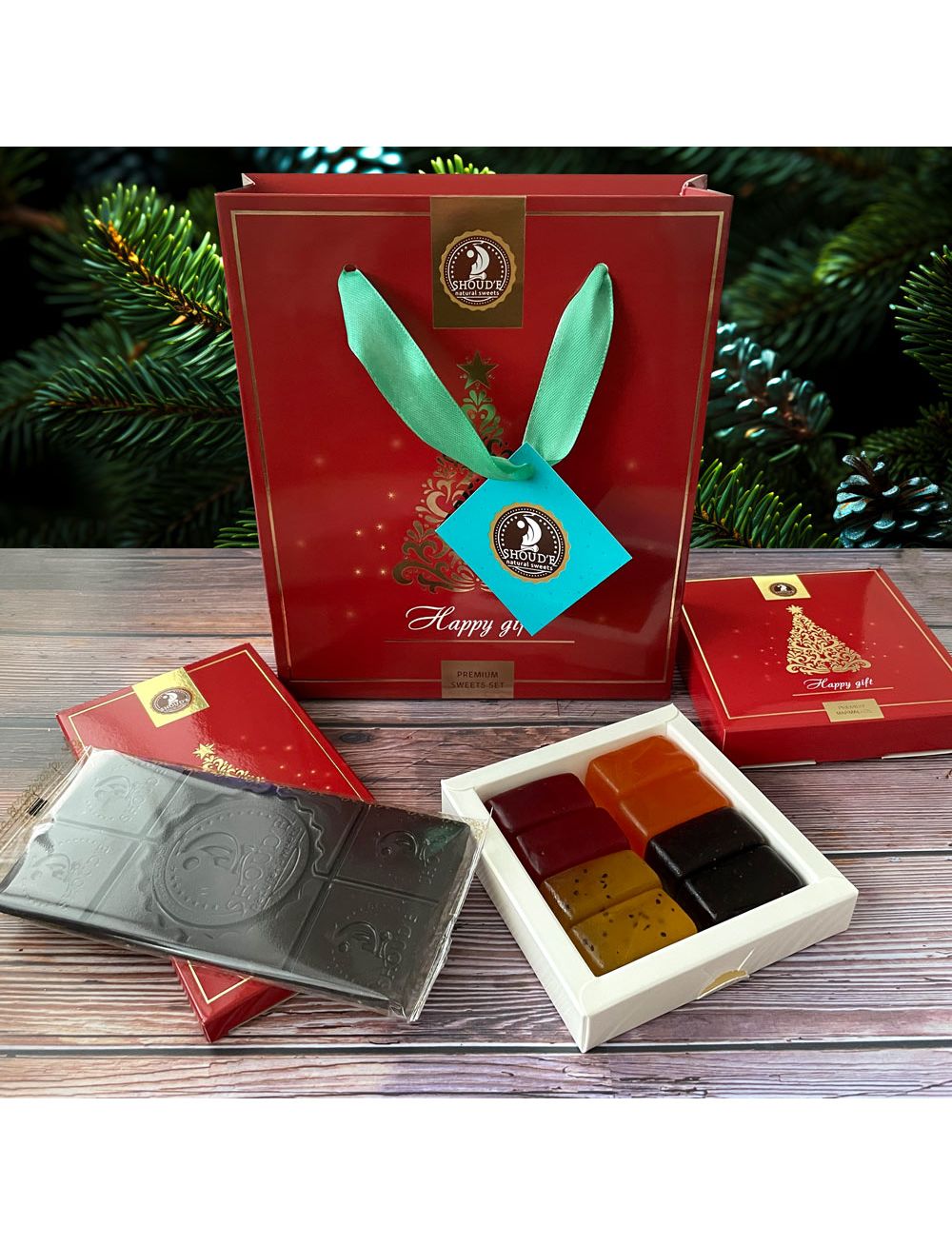 Склад набору: шоколад «Shoud’e» темний – 70г., мармелад «Pate de fruits» асорті – 190г (ківі-банан, смородина-полуниця, манго, журавлина-абрикос)