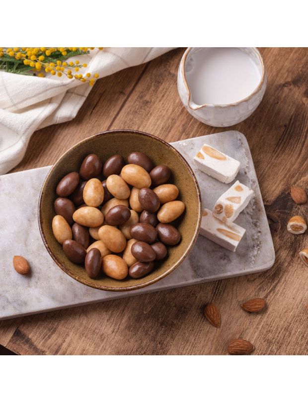 Склад: цукор, МИГДАЛЬ 21%, какао-масло, МОЛОКО сухе, крем нуга 6% (МИГДАЛЬ, цукор, глюкозний сироп, мед, натуральний ароматизатор ваніль, картопляний крохмаль, яєчний альбумін), какао терте, гуміарабік, емульгатор (СОЄВИЙ лецитин), ванілін, глазурувальники (глюкозний сироп, Е904).