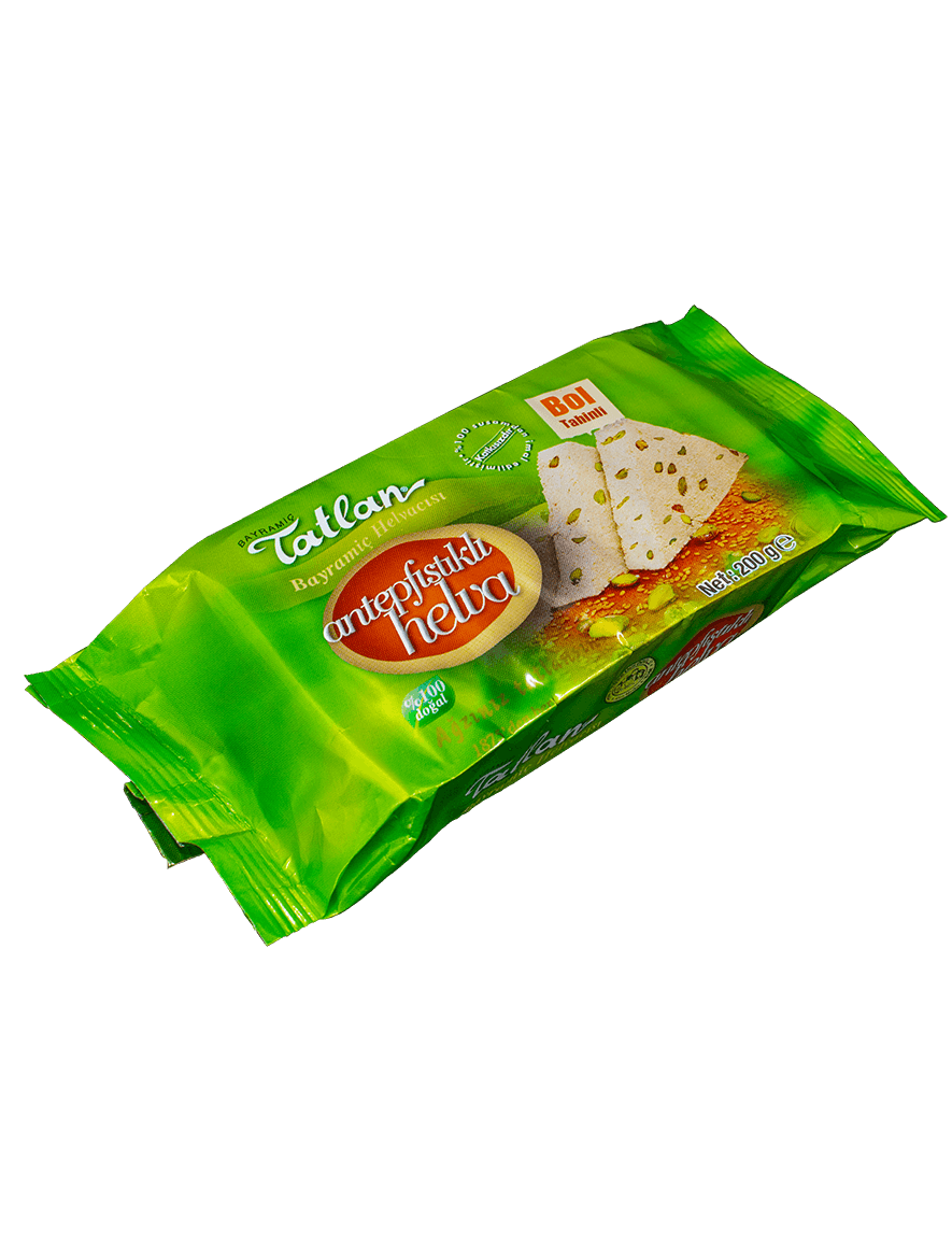 Наша халва, виготовлена на 100% натурального кунжуту та 100% натурального тахіні, є водночас смачною та смачною та значною мірою сприяє вашому здоров’ю. Фісташкова халва Татлан виготовлена з натурального кунжуту і тахіні, зміцнює захисні сили організму і підвищує імунітет проти вірусів і бактерій. Задовольніть свою тягу до солодкого здоровим і смачним способом з фісташковою тахіні халвою Tatlan 200 гр. Фісташкова халва Татлан стане невід'ємною частиною ваших столів. Відкрийте для себе натуральний і корисний смак тахінної халви з фісташками. Tatlan Pistachio Tahini Halva дарує вам унікальний смак у кожному шматочку.