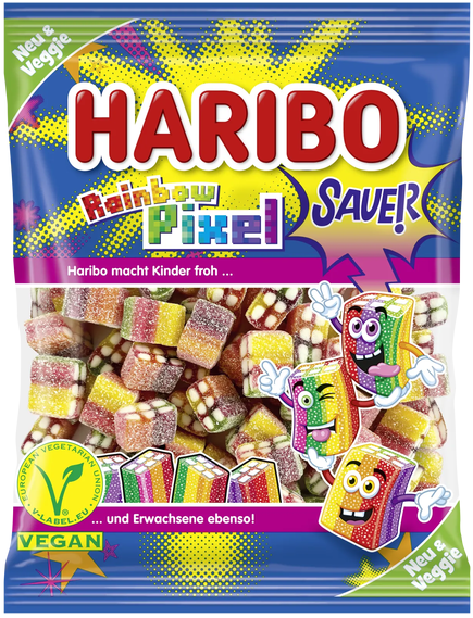Готові до повної потужності пікселів? З HARIBO Rainbow Pixel ви відчуєте справжній блиск кольорів. Ці барвисті пікселі мають особливо високу роздільну здатність, особливо під час перекусу. Веганський, з кислим наповненням і в кольорах веселки. З'їжте щось кольорове!