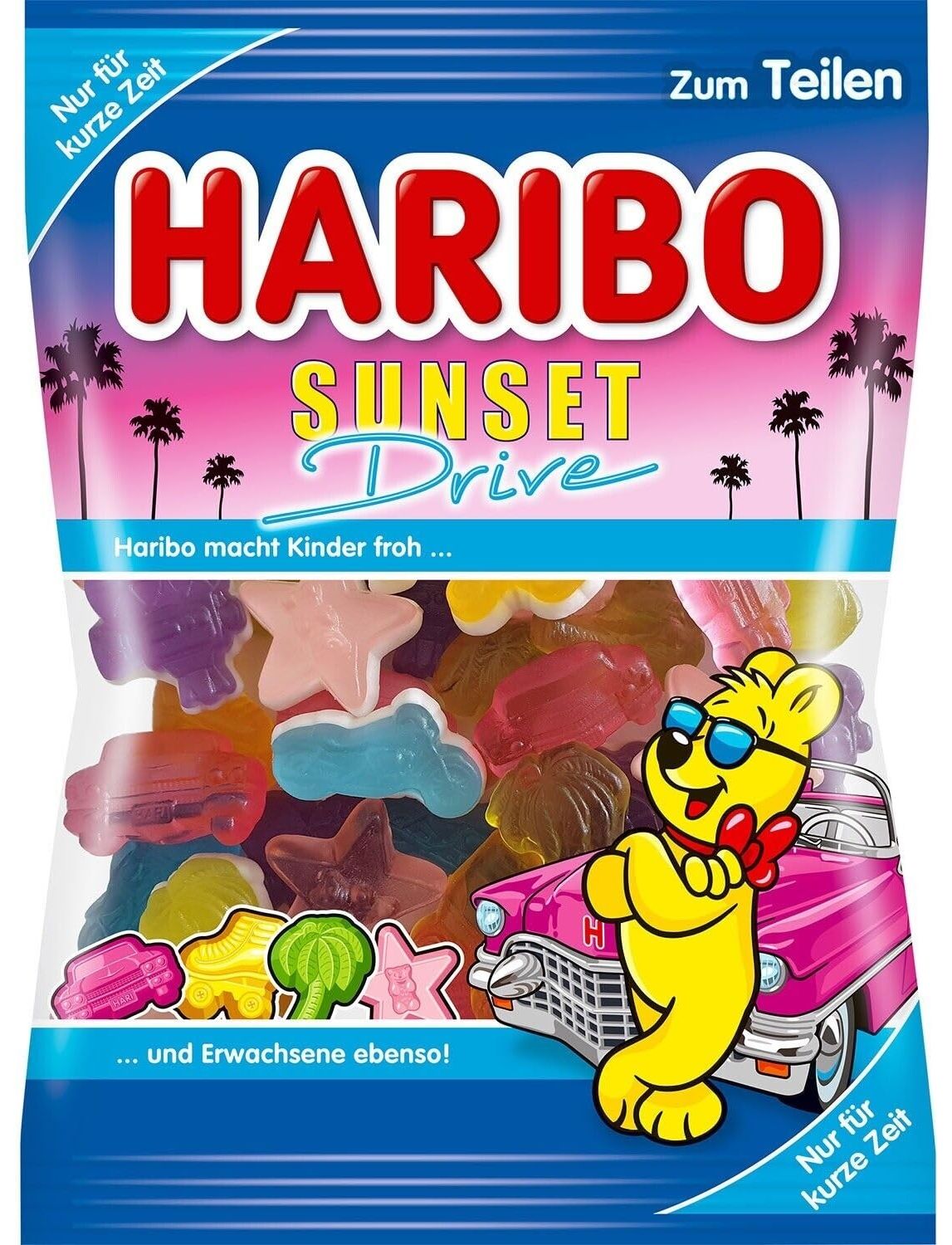 Крута смакова подорож! З Haribo Sunset Drive ви можете очікувати фруктових перекусів, які особливо вражають своєю оригінальною формою. З нетерпінням чекайте барвистих Caprios, зірок, пальм і роликових ковзанів, які спокушають своїм фруктовим смаком. Смачні фруктові гумкові фігурки були частково наповнені цукровою піною, завдяки чому пропонують чудову різноманітність.