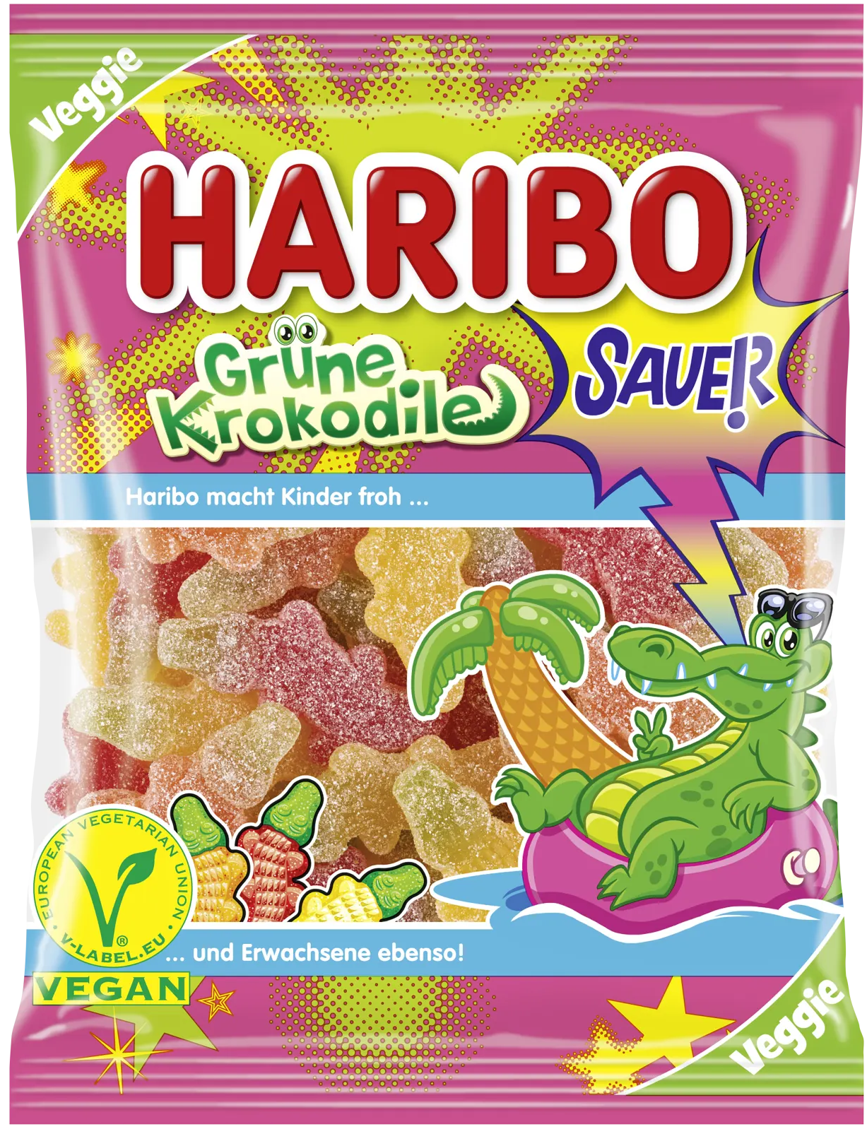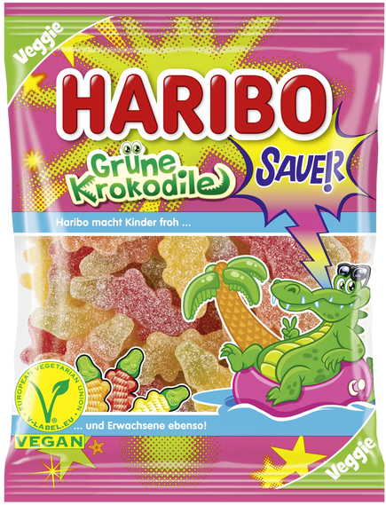 Go Green! Смачні Haribo Green Crocodiles Sour — це не тільки смачна розвага для вегетаріанців! Двоколірні ласощі можуть похвалитися двома смаковими комбінаціями. Вишня та яблуко, маракуйя та яблуко та апельсин та яблуко забезпечують освіжаючу зміну та насолоду своїм м’яким укусом.