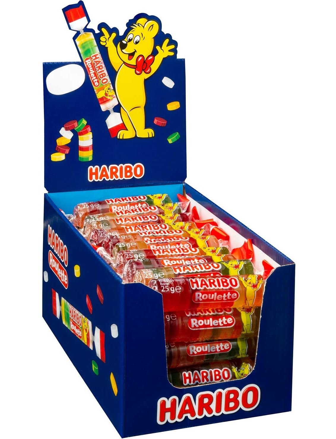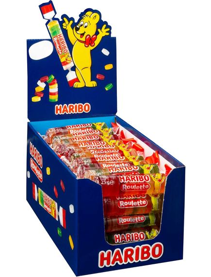 Барвиста рулетка Haribo пропонує багато різноманітності в одній ролі. Для багатьох це особлива розвага; Оскільки смачні скибочки фруктової гумки сортуються випадковим чином, тож ви ніколи не знаєте, яким смаком ви зможете насолодитися наступним. Дозвольте собі здивуватися фруктовим смаком.