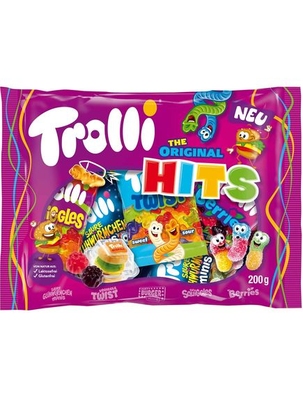 Кращі з кращих беруться за руки. Усі зірки Trolli зустрічаються в Trolli The Original Hits. Упаковка містить багато практичних міні-пакетів із популярними фруктовими клейкими ведмедиками та численними іншими спеціалізаціями. Навіть знаменитий міні-бургер Trolli робить честь. З цим асортиментом ви гарантовано отримаєте свої гроші.